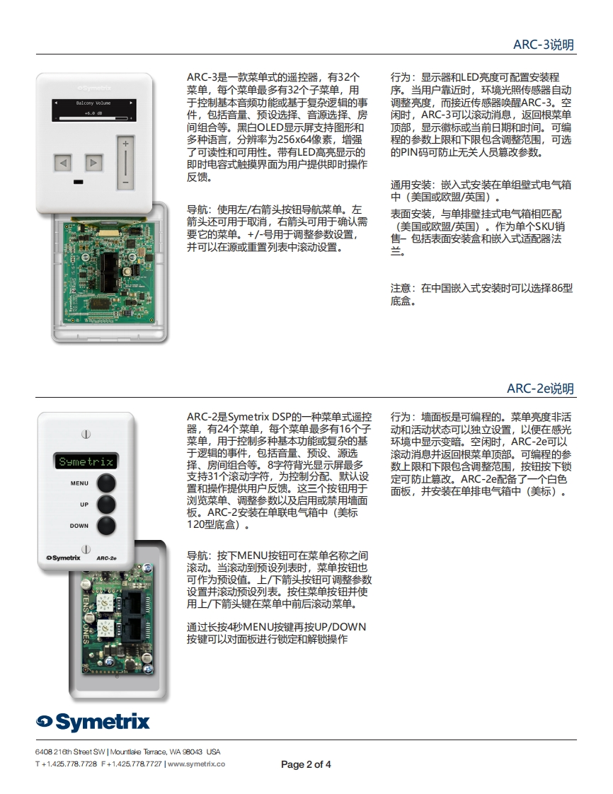 ARC墙面板ARC (Adaptive Remote Controls)ARC的重要性:对音响系统最真实的考验是终端用户如何轻快速可靠:ARC通过RS-485进行通信,这是一种标准的远松操作它。Symetrix开发了ARC系列壁板,便于最终用户程通信协议。命令集被分配给特定的ARC。ARC可提供多控制SymetrixDSP系统。ARC处理音乐源选择、音量控种形式的因素,可以从多个位置对复杂参数进行简单控制、寻呼控制、房间组合等。灵活且模块化,它们可以混合制。例如,单按钮按下可以调用预设,为备用应用程序重和匹配,为任何和每个声学空间提供最佳用户控制。新配置整个系统。按钮组合锁定、用户提供的钥匙锁或PIN码等安全功能确保只有合格的用户才能对系统进行调易于实施:在评估远程控制选项时,一个重要的考虑因素是整。易于集成。第三方控制系统可能非常昂贵,需要相当多的专业知识来编程和部署。ARC的编程使用与配置Symetrix标准电缆和连接器:ARC通过CAT5/6连接到DSP。多个DSP硬件相同的软件应用程序。配置和测试只需要几分钟ARC通过每个ARC上的双RJ45连接器菊花链连接。而不是几天。设备D(必要时)分配有旋转十进制开关。ARC控制参数存储在DSP硬件中,如果需要,可以方便地调用和修改。D①自a1 cony Ve1eeSymetrixMENUUPDOWNSymetrixAG2e0①ARC-3ARC-2eARC-SW4eARC-EX4eRC-3CABLE SEGMENT LENGTH LIMITATIONS FOR ARC POWER OVER CAT5CABLEARC TYPENumber of ARC's onchainARC-3ARC-2eARC-K1eARC-SW4e130003000T32503250211001200300030003550700125012504200250400400ARC PORT PINOUT-1·AUDIO(+]2.AUDIO (-3·COMMON GROUND4.RS-485 DATA (A)5·RS-485DATA(B)6·COMMON GROUND7.POWER (+V)8·POWER(+VNote:The ARC Audio line may be grounded at theSymetrix rack-mount device and the ARC wall panelSymetrixto provide additional distance.6408216th Street SW Mountlale Terrace,WA 98043 USAT+1.425.778.7728F+1.425.778.77271 www..5 ymetrix.coPage 1 of 4