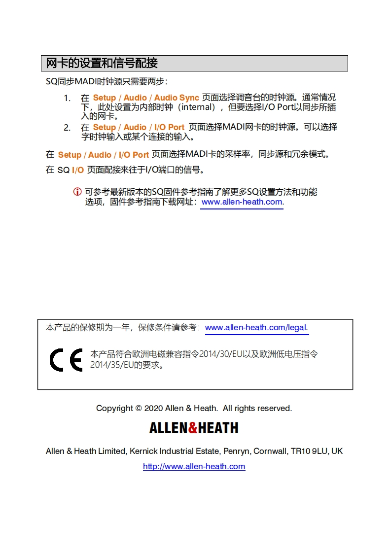SQ MADI选卡M-SQ-MADI-A是Allen&Heath SQ调音台适用的其中一个网络音频卡。它可通过同轴BNC提供64x64通道的48/96 kHz AES MADI(AES1O)音频传输。①SQ MAD1需要SQV1.5.2或更高版本的固件运行环境。①为避免BNC接口遭受损坏,请谨慎进行线缆的插接操作,保证线缆正确连接BNC标准接头(1EC60169-8)。网卡插接方法1.关闭系统。2.用ToxT8螺丝刀拧开SQ调音台的/O端口空白面板处的2根螺丝。3把网卡插入卡槽中,保证按进正确的接口。4.重新装上2根螺丝,固紧网卡。前面板Link1Link 2BNC接口,用于连接150m线距以内通过配置可作为ik的冗余接口,或作为MADl的752同轴线缆。它提供端口使用。关闭冗余模式后,它可提供:输入1-64,输出1-64@48kHz。输出1-64@48kHz。输入1-32,输出1-32@96kHz。输入33-64和输出33-64@96kHz。OUTOUTINOUTMADIWORDCLOCKLnkLnk/Err/ErININLnk/Err黄灯闪烁表示有网络接入。Word clock配置后作为字时钟红灯表示侦测连接或数据故障。输入或输出使用。LED提示当前的模式。M-SQ-MADI-A Fitting NoteAP12392 Issue 1