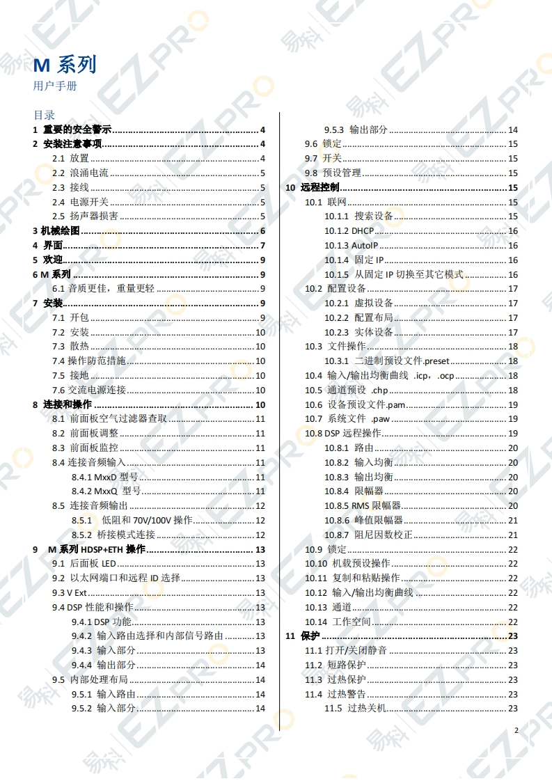 易科EZPRO陈、79M系列功放EZPROPRO易科M30D/M30D HDSP+ETHM20DM20D HDSP+ETHM14D/M14D HDSP+ETHM50Q/M50Q HDSP+ETHEZPROM28Q/M28Q HDSP+ETH沙PRO用户手册P易科E☑2014年3月三ZPREZPROPRO©2014 PowersoftD0000100保留此手册供下次使用powersoft_MSeries_uguide_en_v2.9