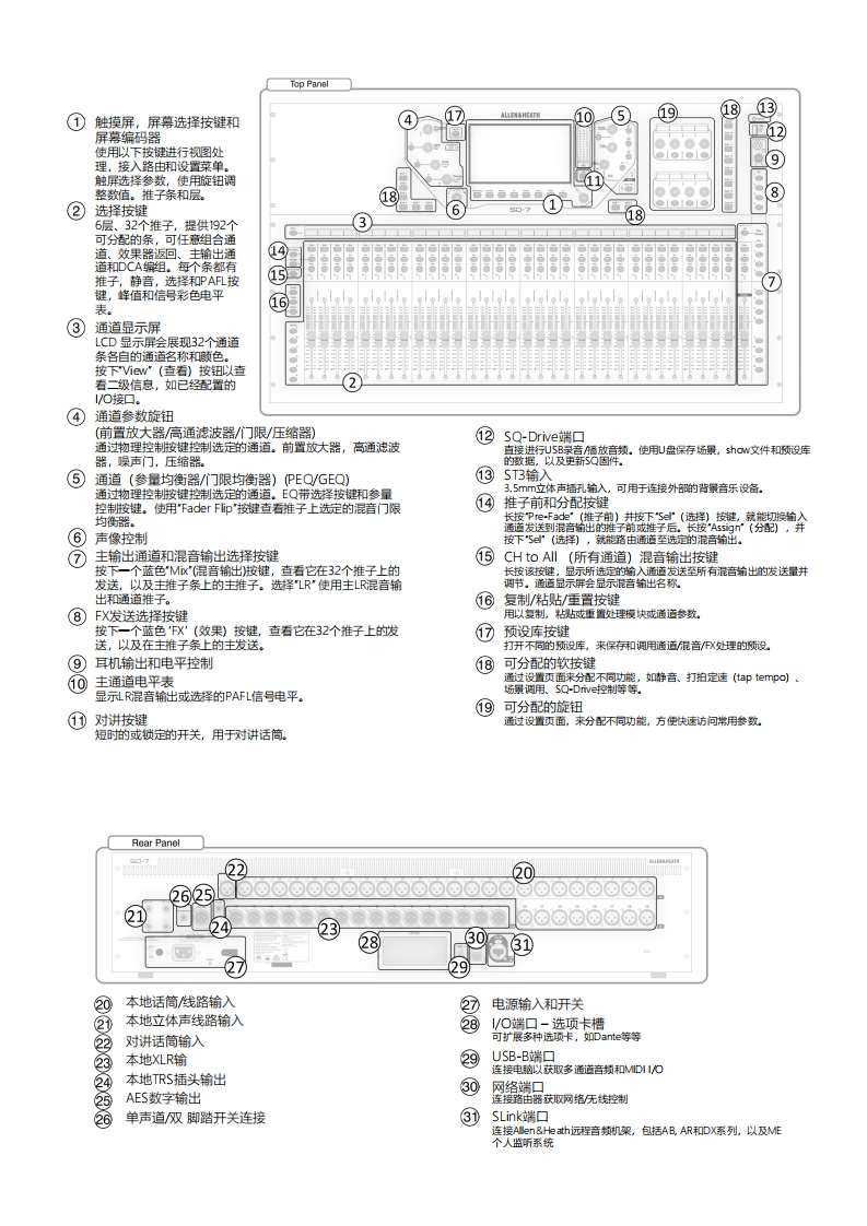 ALLEN&HEATHSQ-☑AP11350 Issue1介绍安全在启动SQ之前,阅读安全说明表(AP9240/CL1-1),该表与本指南一起提供。为了您与操作人员、技术人员和演出人员的安全,请遵循这些文件中的所有说明并留心所有的警告,并直接印在设备上。注册为了及时获知SQ系列相关的更新、最新固件和新版本等信息,请为您的SQ-7进行注册,注册网站:w.alen-heath.com/register固件和参考指南该介绍旨在帮助您了解SQ-7硬件和整体操作原则。请访问ww.alen-heath.com以获取最新固件版本和参考指南。若您需要在SQ上使用SQ应用,您必须更新至最新固件版本。设备通☒SQ使用风扇冷却。须预留足够的空间以保证使用过程中风扇和通风口的空气流通。特性SQ是96kHz高分辨率的调音台。它运用了新的技术,能提供细化、准确的声音。SQ还提供了一系列的扩展和集成选项。5Q系列SQ-7特性48个输入通道,本地前置放大器;高通滤波器;参量均衡器;门192个推子条(32+1个推子,6层);32个限;压缩器;延迟;32个输出总线(LR,12路单声道/位体声混本地话简/线路输入;3个本地立体声线路音输出;3路立体声矩阵输出);8个立体声FX引擎,带专用返回输入;16个XLR+2个TRS输出插槽:16个通道;8个静音分组,8个DCA分组;I/O自由分配(本地,SLik可分配软按键:8个自定义旋钮,带LCD扩展接口,网络音频卡槽,USB多轨录音及回放);可通过/O设置将外置效果器插入至输出通道;多通道USB多轨录音回放或直显示接进行U盘录音及回放;对讲话简输入;双脚踏控制;无线控制SLink端口兼容性采样率协议最大长度DX168,DX164-W,DX集线器96kHzDX100mCat5e或更高AR2412,AR84,AB16848kHzdSnake120mCat5e或更高ME-U,ME-1,ME-50048kHzdSnakeCat5e或更高配件SQ支架可拆分的金属支架,用于iPad/或平板电脑AP11334防水聚酯防尘罩,印有$Q-7商标AR848路XLR输入,4路XLR输出,dSnake远程音频机架(机架安装)AR241224路XLR输入,12路XLR输出,dSnakei远程音频机架(机架安装)AB16816路XLR输入,8路XLR输出,dSnakei远程音频机架(舞台箱/机架安装)DX16816路XLR输入,8路XLR输出,96 kHz DXi远程音频机架(舞台箱/机架安装)DX164-W16路XLR输入,4路XLR输出,96 kHz DX墙面安装音频扩展器DX集线器远程音频集线器,带4个DX连接端口(标配机架安装套件)AH96501O0 m EtherFlex超五类网线缆车(drum),带纽崔克EtherCon锁定接头AH998150 m Ether Flex超五类网线缆车(drum),带纽崔克EtherCon锁定接头AH965120rm纽崔克EtherFle以CatSe,带纽崔克EtherCon锁定接头