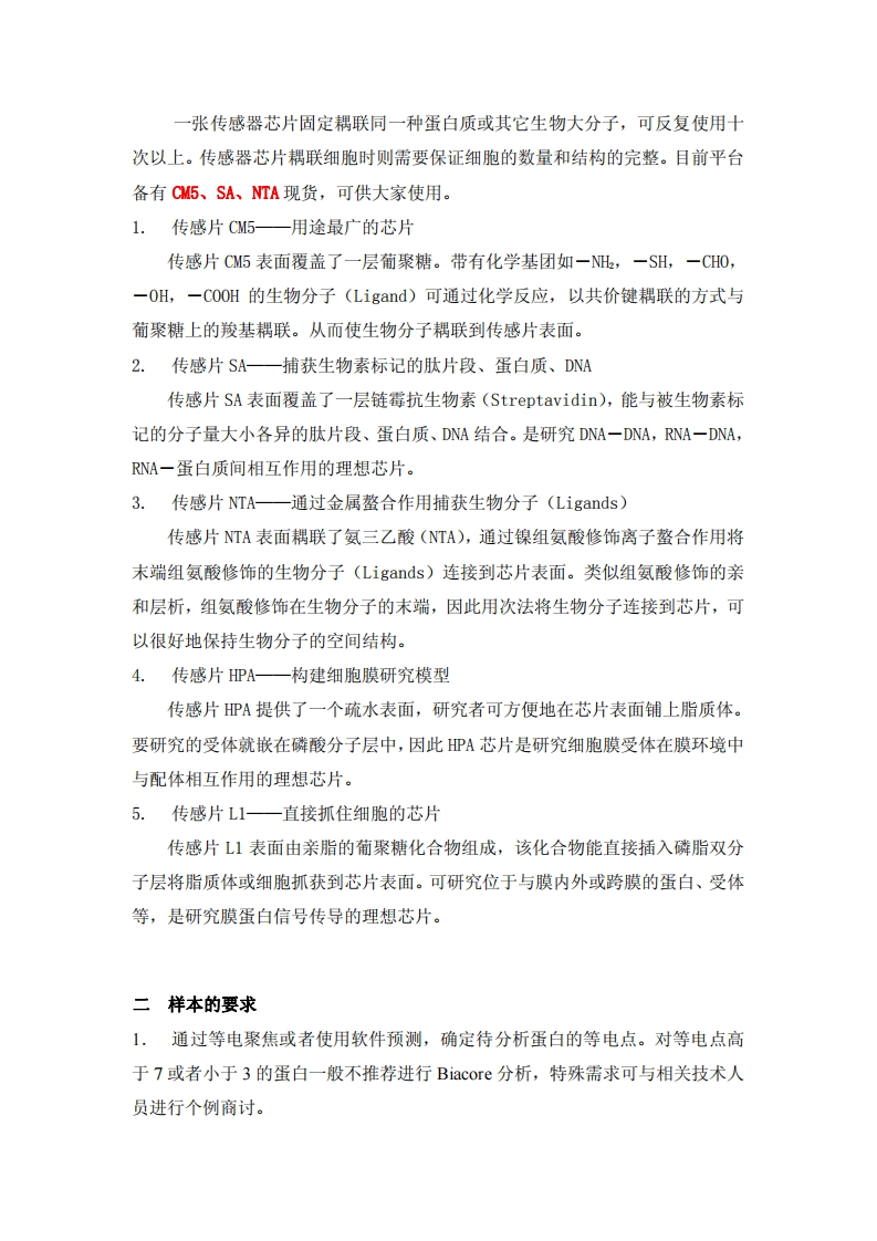 BIAcore-生物分子相互作用分析仪原理和操作注意事项BIA(Biomolecular Interaction Analysis)提供了实时观察生物分子间相互作用的技术。通过它能观察两种分子结合的特异性,能知道两种分子的结合有多强,还能了解生物分子的结合过程共有多少个协同者和参与者。BIA可以让得到用其他技术方法难以得到的结果,因为它可以实时反映分子结合过程中每一秒变化的情况。无需借助标记物进行分析使BIA广泛应用于各类生物体系的测定,从各类小分子化合物、多肽、蛋白质、寡核苷酸和寡聚糖直至类脂、噬菌体、病毒和细胞。BIA就是利用金属薄膜表面的折射率的改变,引起共振角的变化,来推断金属薄膜表面的变化。实验时先将一种生物分子固定在传感器芯片表面,将与之相互作用的分子溶于溶液流过芯片表面。检测器能跟踪检测溶液中的分子与芯片表面分子的结合、解离整个过程的变化。BIA技术是基于一种表面等离子共振(SPR)的物理光学现象的生物传感分析技术。不必使用荧光标记和同位素标记,从而保持了生物分子的天然活性。当入射光以临界角入射到两种不同透明介质的界面时将产生全反射,且反射光强度在各个角度上都应相同,但若在介质表面镀上一层金属薄膜后,由于入射光可以引起金属中自由电子的共振,从而导致反射光在一定的角度内大大减弱,其中使反射光完全消失的角度称为共振角。共振角会随金属薄膜表面通过的液相的折射率的改变而改变,折射率的变化(RU)又和结合在金属表面的大分子质量成正比。因此,BA技术可以通过对反应全过程中各种分子反射光的吸收获得初始的数据,并经相关处理获得结果一传感图。各种传感片的理化特性及用途传感器芯片是实时信号传导的载体。芯片结构是在玻璃片上覆盖了一层金膜,各种类型的芯片在金膜表面连有不同的多聚物以形成不同的表面环境,利于固定不同性质的生物分子。实验时先将一种生物分子固定在传感器芯片表面,将与之相互作用的分子溶于溶液流过芯片表面。检测器能跟踪检测溶液中的分子与芯片表面的分子结合、解离整个过程的变化。目前传感器芯片的种类有十余种。根据传感器芯片表面的物理化学特性适合耦联不同的蛋白质或其它生物大分子。