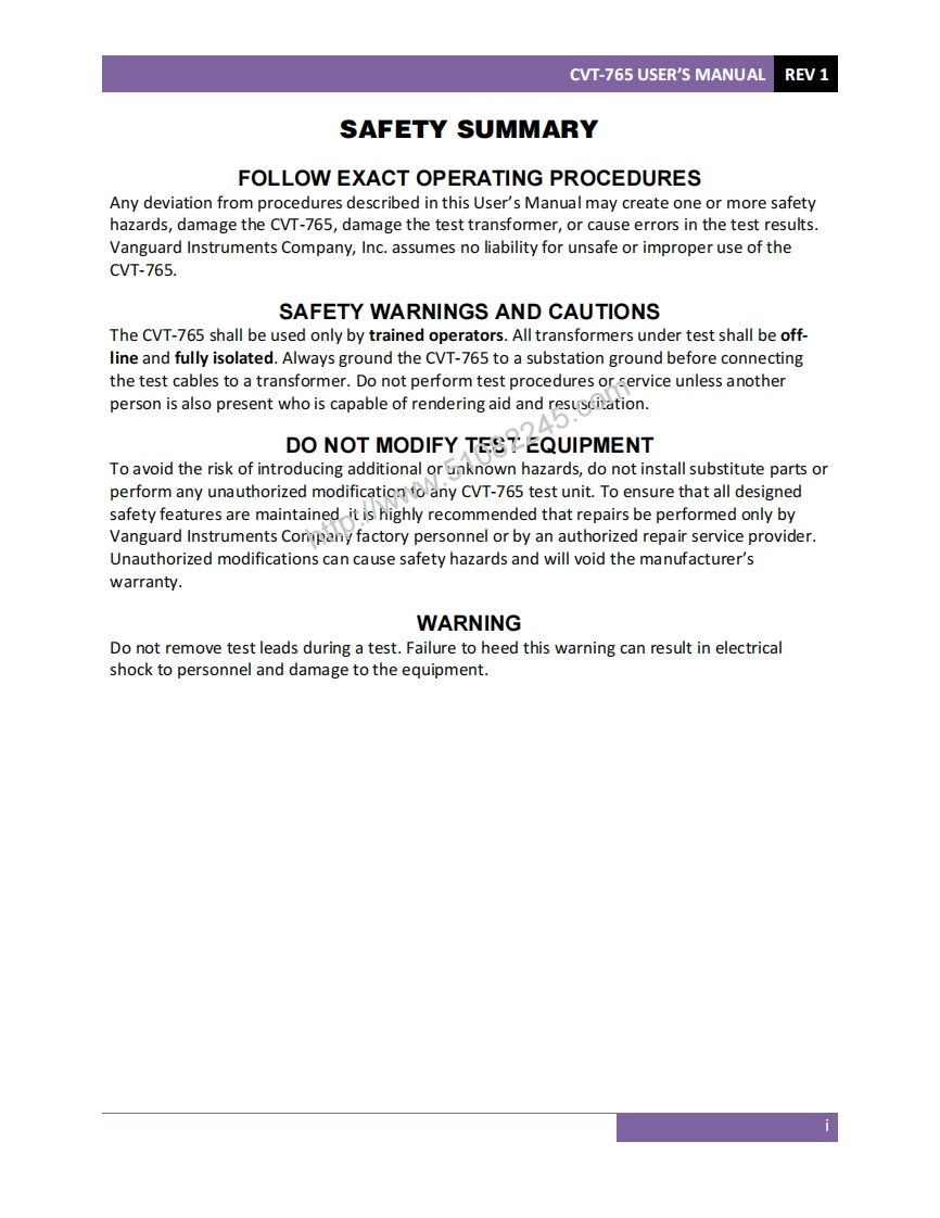 CVT-765Capacitor Voltage Transformer Ratio TesterUSER'S MANUALttp://w51082x6.comcv CVT-765"1,LU州TESTWARNINGISETUP3.USER DIAGNOSTIC2H1H2TSOOVAC三Vanguard instruments Co.,Inc.Vanguard Instruments Company,Inc.1520 S.Hellman Ave.Ontario,California 91761,USATEL:(909)923-9390May 2011FAX:(909)923-9391Revision 1