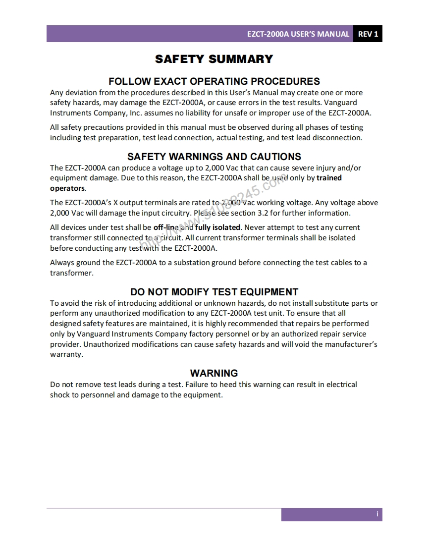 EZCT-2000ATMDIGITAL CURRENT-TRANSFORMER TESTERUSER'S MANUAL心8http://vww0Vanguard Instruments Co.,Inc.Vanguard Instruments Company,Inc.1520 S.Hellman Ave.Ontario,California 91761,USATEL:(909)923-9390February 2010FAX:(909)923-9391Revision 1