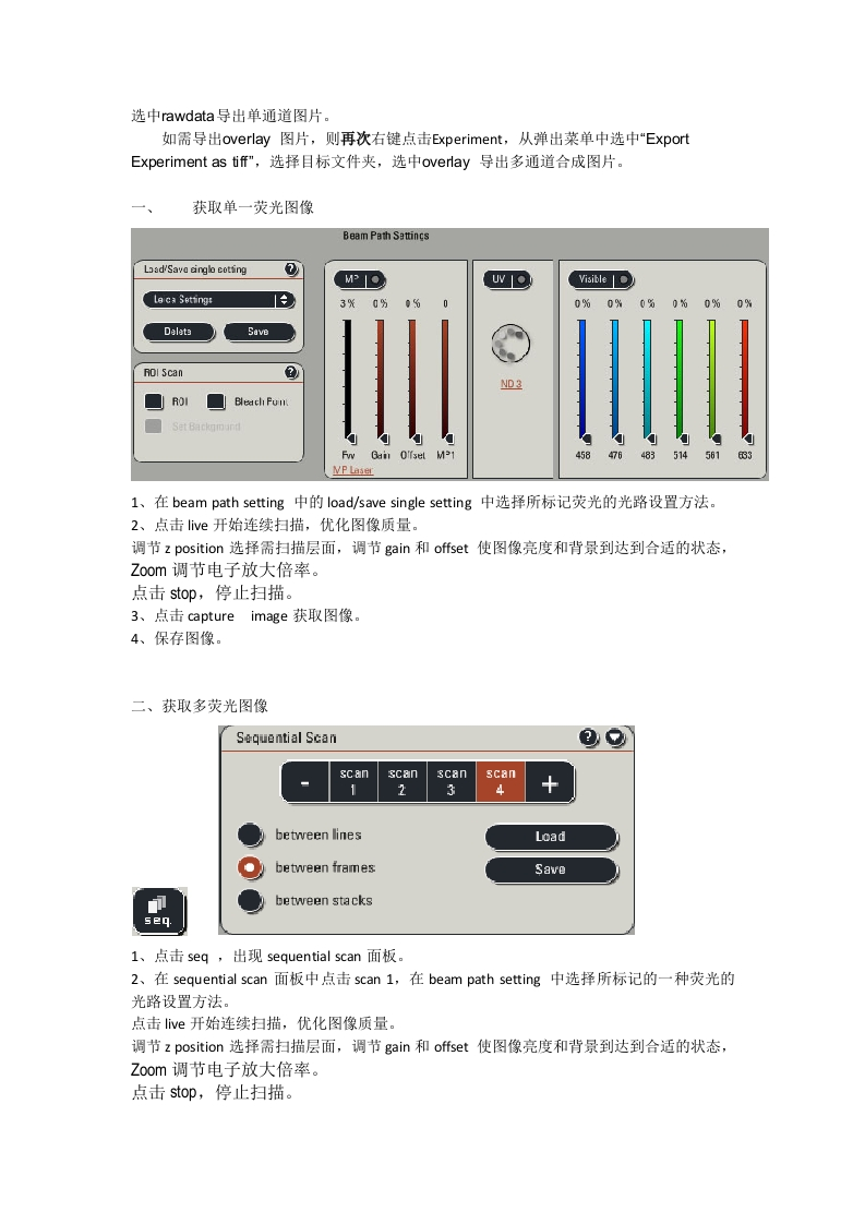 Leica TCS SP5激光共聚焦显微镜系统软件操作手册打开软件后,默认在Acquire面板的acquisition中,acquisition mode为yz,Format扫描像素为512x512,average1 ine and frame average为1。客I8 1 VFRSKINI☒Nicre LA3·T5罗IT”shh以0Y出:经-m1是CBw®回'四包w:日■fnm=5:n城DnFElsia u:cnFFw咖n■日LeeL17:152T3T☒水tc139|Emkt inasa|选择扫描模式,xyz层面扫描xyt时间扫描xy入光谱扫描扫描像素一般选1024×1024设置平均一般选择line average4-8次保存图像方法注意:从获取第一张图片后就要开始保存,以后每获取一张图片都要保存一次,以免数据丢失。1、保存eica.if文件进入Acquire面板的Experiment中,右键点击Experiment,从弹出菜单中选中“SaveExperiment“Experiment'"as.",保存Iif文件到自己的文件夹中并取名。2、导出if文件右键点击Experiment,从弹出菜单中选中"Export Experiment as tiff'",选择目标文件夹,