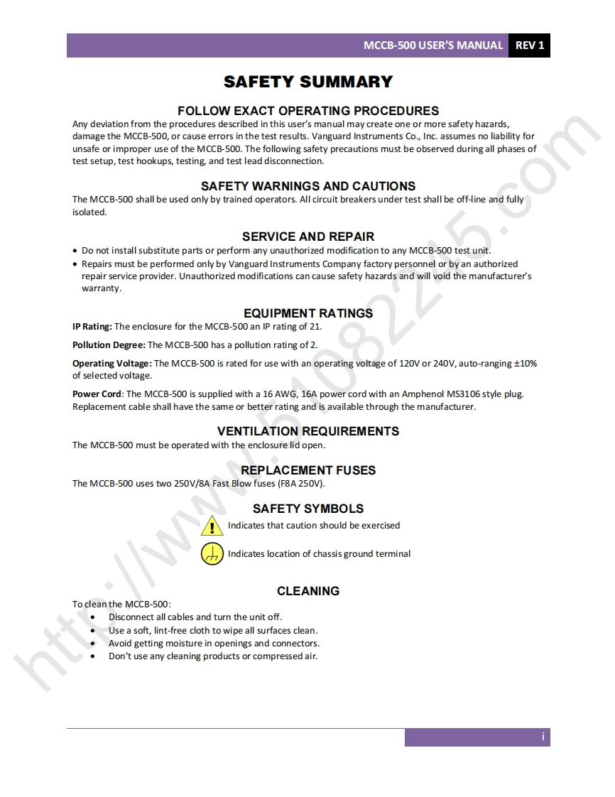 MCCB-500MOLDED-CASE CIRCUIT BREAKER TESTERUSER'S MANUALGMCCB-500"M⊙CURRENT●2me4✉CONTRAST●125⊙●-saouCONTRDLTIMER STOP⊙●Ow.5TAT○-caY-DFF●-wr120V B0494⊙●-MOWT●--CURRENT●Vanguard Instruments Co.,Inc.USA125ACOM500A25AVanguard Instruments Company,Inc.1520 S.Hellman Ave.Ontario,California 91761,USATEL:(909)923-9390January 2015FAX:(909)923-9391Revision 1.0