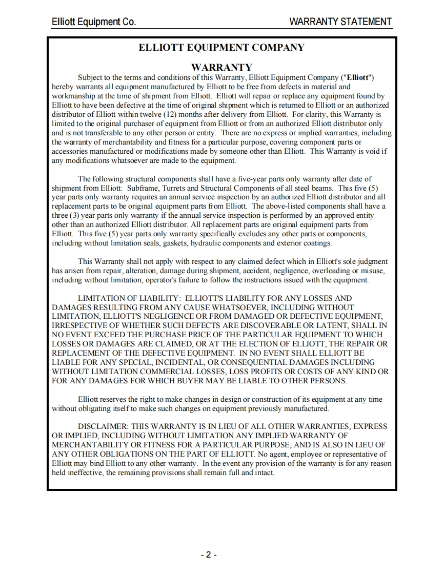Elliott Equipment Co.INTRODUCTIONINTRODUCTION个DANGERDo not operate this crane until you haveread and thoroughly understand thisREAD,UNDERSTAND AND FOLLOWmanual,the accompanying AssociationALL SAFETY LABELSof Equipment Manufacturers "SAFETYBEWARE OF OVERHEAD POWERMANUAL FOR OPERATING ANDLINESMAINTENANCE PERSONNEL",allUNDERSTAND AND NEVERdecals on the crane and you have beenATTEMPT EXCEEDING CRANE LOADproperly trained by an experienced,CHARTSqualified crane operator.TheNEVER EXCEED OPTIONALinformation in these manuals is a guidePLATFORM CAPACITY AND AREASto assist qualified personnel in safeOF OPERATIONoperation and maintenance of this craneand is not a substitute for training.experience and common sense.This manual must be retained with thisboom truck for use by subsequentIf there is a question on applicationoperating personnel.and/or operation,contact the ProductSafety and Reliability Department atElliott Equipment Company.If an ElliottCrane is involved in a personal injury orproperty damage incident notify theProduct Safety and ReliabilityDepartment as soon as possible.Havethe model and serial number and detailsof the incident recorded prior to thefactory.Elliott Equipment Company4427 South 76th Circle0maha,NE68127-1806Ph.402-592-4500FAX402-592-4553e-mail info@elliottequip.comwww.elliottequip.comAlways refer to ANSI/ASME B30.5standards for safe operation,inspectionand maintenance of this crane.Federal,state and local laws.rules andregulations along with safety codes andinsurance requirements takeprecedence over any information in thismanual.See the CIMA manual for correct,safeoperation near power lines and handsignals.-1