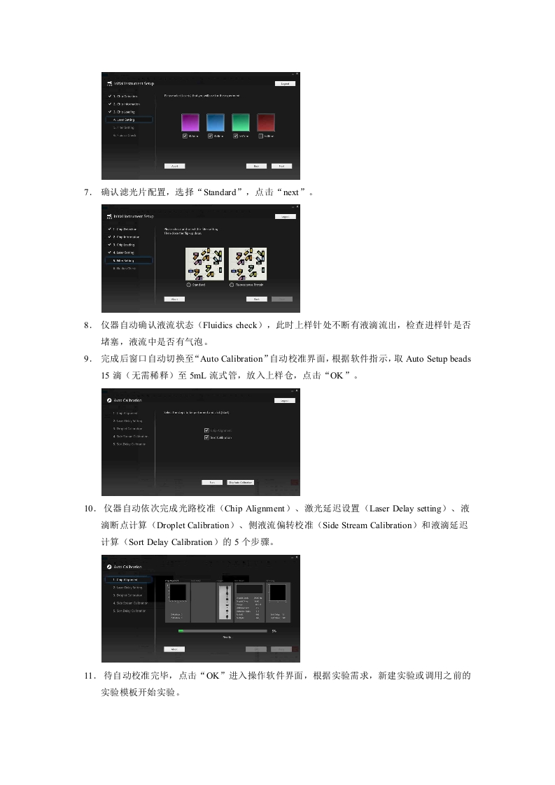 Sony MA900分选仪开关机操作流程开机前准备√准备足量的无菌鞘液(PBS)》开机检查检查补充鞘液√清空废液桶关机清理√运行关机清洗(Bleach clean+DI Rinse)√清理上样仓和样本装载器√清理收集仓(包括收集台,收集管适配器,相机窗口和激光窗口)√清理电极板√清理防溅片√清理废液槽开机1.检查鞘液和废液水平,鞘液桶补充PBS,水桶补充去离子水,清空废液桶。2.打开总电源,先开空气压缩机,待压缩机稳定,再开启仪器面板上的Power/Standby开关。3.开电脑,待细胞仪显示屏上状态显示为“Standby”,再打开桌面上的MA900软件,等待软件联机,用户登陆成功后,自动进入“Initial Instrument Setup”开机向导界面。irHN lecnmes Senp14,34d4.取分选芯片根据软件指示,用电脑摄像头扫描包装上的二维码。5.打开翻盖门,软件点击“ext”,此时旧芯片会被自动弹出,取出旧芯片插入新芯片(注意芯片方向不要插反,SONY字样面对操作者本人)。芯片轻轻推入至一半时会被自动吸入,并完成液流管路与芯片管路的自动密封,点击“ext”。hital inenmene inpV1:1Mb-√又有上m■4m9场6.根据实验需求勾选所需Laser(至少勾选488一个),点击“next”。