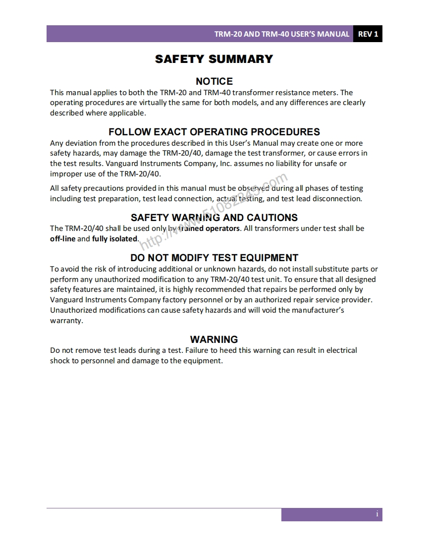 TRM-20 and TRM-40TRANSFORMER RESISTANCE METERSUSER'S MANUALww51082245.comhttp:T9IA-40TRM-40Vanguard Instruments Company,Inc.1520 S.Hellman Ave.Ontario,California 91761,USATEL:(909)923-9390November 2011FAX:(909)923-9391Revision 1.2