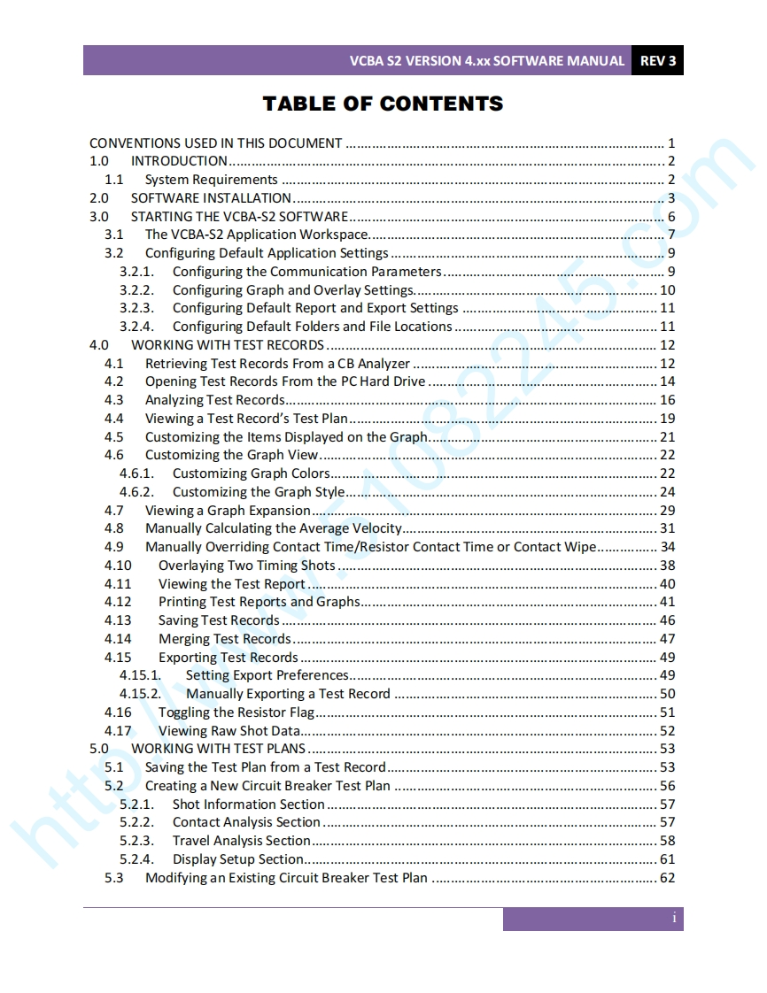 VANGUARD CIRCUIT BREAKER ANALYZER-S2(VCBA S2)VERSION 4.xx SOFTWARE MANUALFor Use with Vanguard'sDigiTMR S2,DigiTMR S2 PC,CT-6500 S2,CT-7000 S2,CT-7500 s2,and CT-8000Circuit Breaker AnalyzersShat.DAT VCEA-52 Versione 4.3回园P0810000.84 mm40Vanguard Instruments Company,Inc.1520 S.Hellman Ave.Ontario,California 91761,USATEL:(909)923-9390November 2012FAX:(909)923-9391Revision 3