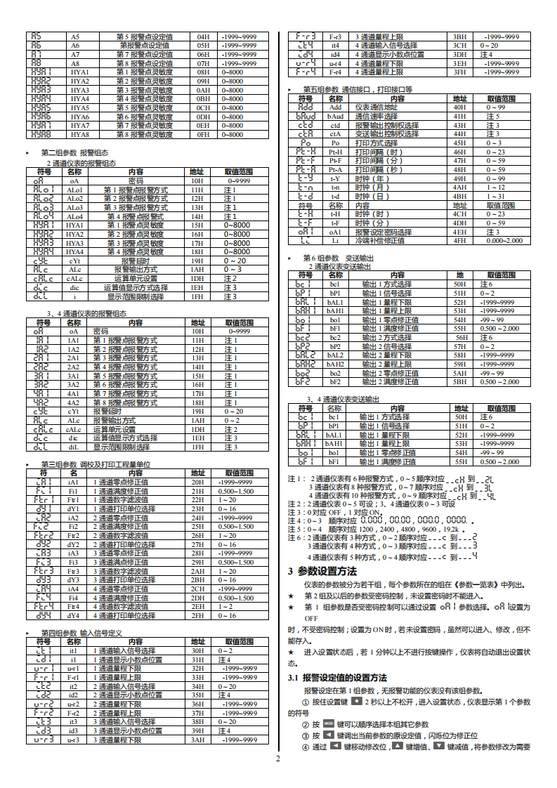 上海亚度电子科技有限公司出伪齿尚尚的尚面品面爸多通道热工表YSD4系列Tel:021-52717238Fax:021-52717556坚坚照吗色罕罕咬惑西以RL1使用说明四为了您的安全,在使用前请阅读以下内容输入接线图■注意安全请不要使用在原子能般备、医疗器减等与生命相关的设备上(1)仪表与热电阳或远得(2)仪表与热电偶及电流积(3)表与电客的要压输入的接线本仪表股有电源保验丝,请在本仪表电领供电回路中设置保验丝等安全路器件,庄力表接线请不要在本产品所提供的规格范困之外使用.●请不受使用在易燃易爆的场所,入请避免安装在发热大的仪表(器、变器、大功率电姐)的正上方,△普告周困度为50以上时,请用强制风扇或冷却机冷却,但是,不要让冷却空气直接口设置吹到本仪表对于盘装仪表为了避免用户近电源端子等高压盼,请在最修设备上采取必要措施,1面板及按键说明(以160×80尺寸的仪表为例)本产品的安装、调试雄护应由具备资质的工程技术人员进行,如果本产品的故障或异常有可能导致系统重大事故,请在外部设置适当的保护电路,以防止事故发生,本公司环承相除产品本以外的任可直接或问接损失。本公司保留未经通知即政产品说明书的权利,=:8888aaE色旧EE日且EEE:%口外形尺寸图可网4可外形尺寸图:开孔尺寸图:名称说明④1通道测量值显·显示1通道测量值显示窗在参数设置状态下,显示参数符号示窗参数数值规格a mm b(mm mm)H(mm )e(mm f(mm)g mm②、③、④2、3、4通道测量值显示窗·显示2、3、4通道测量值160×8016080109575152.176.1⑤指示灯·各报警点的报警状态指示·测量状态下,按住2秒钟以上不松开则进入设置状态口接线图⑥设置键·在设置状态下,显示参数符号时,按住2秒以上不松开进入下一组参数或2通道仪表必返回测量状态·在设置状态下:①调出原有参数值的酿作⑦左键②移动修改位③确认键·在设置状态下,存入修改好的参数值·在测量状态下启品动时打印③增加键▲在设置状态下增加参数数值或改变设置类型西西@减小键了·在设置状态下减小参数数值或改变设平平平空空空翠置类型恩"2参数一览表e3、4通道仪表第一组参数报警设定值2通道仪表的报警设定符号名称内容地址取值范盟AH第1报警点设定佰00H-1999-9999AL第2报警点定值01H-19999999AHH第3报警点设定值02H-19999999ALL第4报警点设定值03H-1999-99993、4通道议表的报警设定符号名称内容地址取值范烟Al第1报警点设定值00H-1999-9999A2第2报警点设定值01H-199999993A第3报警点设定值02H-19999999A4第4报警点设定值03H-1999-9999