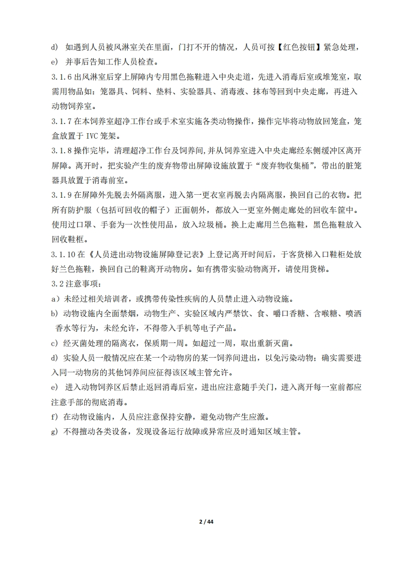 中国科学院分子细胞科学卓越创新中心文件编号CEMCS-ACF-SOP-1-04-2023动物实验技术平台第1页共3页标准操作规程第1版第0次修订人员进出屏障系统的标准操作规程实施日期2023年4月15日1、前言建立动物实验人员、实验动物饲养管理人员、以及其他人员进入实验动物设施屏障系统的标准操作和流程。2、适用范围所有进入动物设施的人员,包括机构工作人员、实验人员和维修维保人员等。3、主体内容3.1人员进出屏障的标准操作和流程3.1.1在规定时间段,使用本人园区卡刷门禁通过客梯或者货梯大门,自己的鞋放置在鞋柜中,换穿外走廊专用兰色拖鞋(如无,可使用鞋套)。3.1.2在第一更衣室门口,先在《人员进出动物设施屏障登记表》上登记,清楚写明课题组、姓名、进入房间等信息,再脱掉拖鞋放入更衣室门口不锈钢鞋柜后进入第一更衣室。3.1.3进入第一更衣室,脱去外套、长裤等,只着贴身衣服,进入第二更衣室前对手部进行75%乙醇喷雾消毒。3.1.4进入第二更衣室,按以下顺序依次穿戴个人防护装置PPE:口罩、帽子→内隔离服上衣→内隔离裤→乳胶手套→外隔离服上衣→外隔离裤。个人防护装置PPE穿戴要求:a)只有眼睛暴露在外,其他部位全部盖住,包括头发。b)隔离服颈部、裤腰、裤脚、袖口等处的系带均需打活结束紧。C)隔离服上衣下摆应放入裤中并束紧腰带。d)隔离服袖口须塞入乳胶手套中。e)镜前检查是否穿戴好。3.1.5出二更后在进风淋室前再次手部喷雾消毒,然后进入风淋室。风淋程序:进入风淋室,关闭风淋室外侧门,自动风淋30秒后开启风淋室内侧门,进入屏障环境,随手关闭风淋室内侧门。风淋注意事项:a)风淋时应举手、转身,确保全身风淋到位。b)风淋室设有闭门系统,未达到设定时间无法开启内侧门。c)风淋间一次不得超过2人。1/44