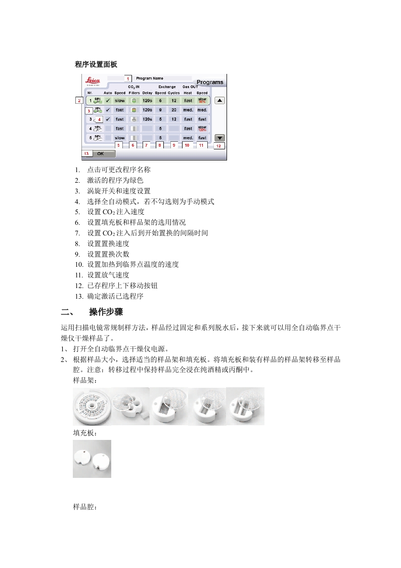 全自动临界点干燥仪Leica EM CPD300操作手册软件介绍屏幕初始化EM CPD300AUTOMICROSYST E MSTouch screen to start主屏二11:1051415mx:rH Pros9r内nl11CPD300 AUTOF2CO,IN 9T17C310 Exchange 5 1 0/14Heataw2站11g20.03G的QUT slow:1213暗灰色按钮己激活,浅灰色按钮未激活」1.仪器型号为CPD3002.点击进入程序设置面板3.显示填充板和包埋槽的使用情况4.显示温度、压力及程序完成剩余时间情况5.点击设置仪器常用参数6.照明开关7.显示程序运行情况8.预设样品室温度9.C02注入速度10.置换速度和预设置换循环的完成情况11.设定临界点温度和达到临界点温度的速度12.放气的速度13.程序开始运行14.时间设置功能15.正在使用程序的名称