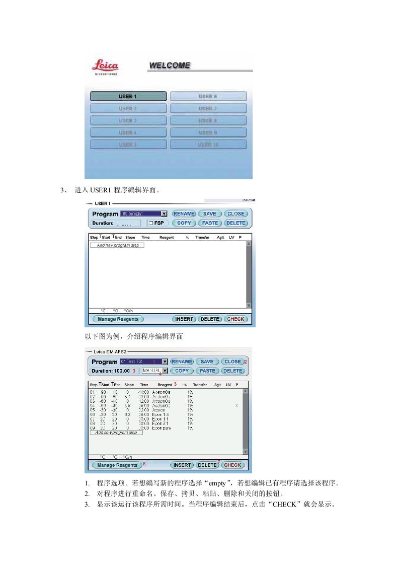 冷冻替代仪操作手册主屏简介Rica1-164℃2 end一000+MICRD1Y室H5-Min.1459080820053T正000009Test FSAceronOs30℃MANUAL Program400008001200Leica EM AFS2START)7MENULOCK06581002.062031、温度设置与显示2、显示程序开始、暂停、下一步和结束的时间3、冷冻室照明开关与TF控制器4、显示正在运行程序详细情况5、显示程序设置及运行情况6、液氮量及冷冻替代室状态显示7、程序开始/暂停/继续按钮8、菜单9、屏幕锁和解锁10、时钟二、操作步骤l、鼠标点击Menu按钮,进入Menu界面。Leica EM AFS2-MenuCLOSE)Leica EM AFS2CHANGE USEREdit Program○View LogCopy ProgramData TransferManage ReagentsSETUPSERVICE2、鼠标点击CHANGE USER,共有十个程序设置供编辑或调用。