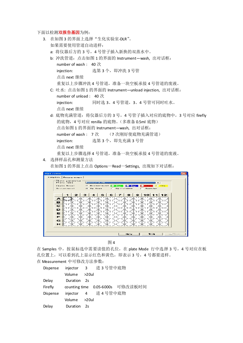 多功能读板机BERTHOLD LB940操作流程型1.打开电脑,打开仪器,指示灯亮3mi以后仪器稳定,打开软件Mikrokin 2000.Ink,,H5▣w'-ry图11点击pen可见对话框如下:打开*par的文件打开?]匹州元小!已114w,+k--2政2斤12些时11栏11-1121节色啦女件名W·T开)女件过T》图2打开*par的文件,窗口如下:打开?X布快克m山:.上ュ上rE一子:阳-A上Eca-b ane4门t:栏D亚I--0l0r15nt 10T南山山的档牛-三生化红-化的世的上已女外虹::中nm打开女件世工:g7黑黑K2收消图3根据自己的实验类型,选择合适的文件。测Bret,选择生化实验室-BRET:测报告基因,选择生化实验室-DLR:测荧光,选择生化实验室-荧光。