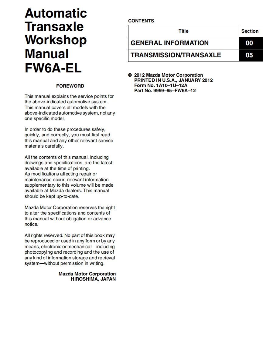 WARNINGServicing a vehicle can be dangerous.If you have not receivedservice-related training,the risks of injury,property damage,andfailure of servicing increase.The recommended servicing proceduresfor the vehicle in this workshop manual were developed withMazda-trained technicians in mind.This manual may be useful tonon-Mazda trained technicians.but a technician with ourservice-related training and experience will be at less risk whenperforming service operations.However,all users of this manual areexpected to at least know general safety proceduresThis manual contains"Warnings"and "Cautions"applicable to risksnot normally encountered in a general technician's experience.They should be followed to reduce the risk of injury and the riskthat improper service or repair may damage the vehicle or render itunsafe.It is also important to understand that the "Wamings"and"Cautions"are not exhaustive.It is impossible to warn of allthe hazardous consequences that might result from failure to followthe procedures.The procedures recommended and described in this manual areeffective methods of performing service and repair.Some require toolsspecifically designed for a specific purpose.Persons using proceduresand tools which are not recommended by Mazda Motor Corporationmust satisfy themselves thoroughly that neither personal safety norsafety of the vehicle will be jeopardized.The contents of this manual,including drawings and specifications,arethe latest available at the time of printing,and Mazda Motor Corporationreserves the right to change the vehicle designs and alter the contentsof this manual without notice and without incurring obligation.Parts should be replaced with genuine Mazda replacement parts orwith parts which match the quality of genuine Mazda replacementparts.Persons using replacement parts of lesser quality than that ofgenuine Mazda replacement parts must satisfy themselves thoroughlythat neither personal safety nor safety of the vehicle will bejeopardized.Mazda Motor Corporation is not responsible for any problems whichmay arise from the use of this manual.The cause of such problemsincludes but is not limited to insufficient service-related training,use ofimproper tools,use of replacement parts of lesser quality than that ofgenuine Mazda replacement parts,or not being aware of any revisionof this manual.