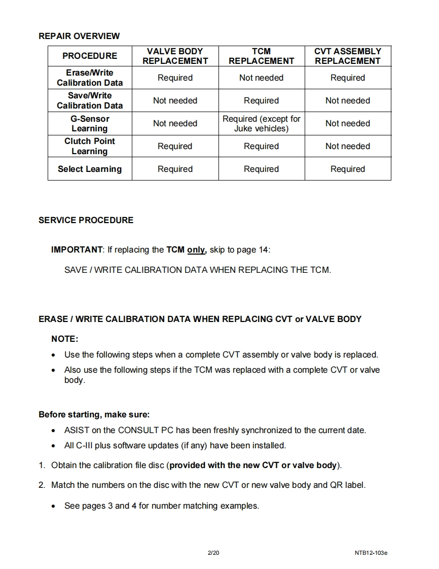 Technical BulletinIISSANSERVICE BULLETINClassification:Reference:Date:AT12-009eNTB12-.103eApril 26.2017CVT TCM CALIBRATION DATA“VRITE”PROCEDUREThis bulletin has been amended.APPLIED VEHICLES has been updated.SERVICE INFORMATIONhas been amended.A REPAIR TABLE has been added.Procedural steps have been added toSERVICE PROCEDURE.Discard all previous versions of this bulletin.APPLIED VEHICLES:2013-2017 Altima Sedan (L33)2013-2017 Pathfinder(R52)2015-2017 Muran0(Z52)2015-2017 Quest(E52)2014-2017 Rogue(T32)2016-2017 Maxima(A36)2015-2017Juke(F15)NOTE:Does not apply to Pathfinder Hybrid,Murano Hybrid,or Rogue Hybrid.SERVICE INFORMATIONThe Service Procedure(starting on page 2)in this bulletin contains the steps to performTCM Calibration Data "Write"Procedures.These procedures are used when a completeCVT assembly is replaced,a CVT control valve (valve body)is replaced,or a TransmissionControl Module (TCM)is replaced.Refer to REPAIR OVERVIEW on page 2.This is a quick reference to determinewhich procedures need to be performed.NOTE:The following information may be helpful when performing the TCM CalibrationData“Vrite”Procedures:When starting the calibration "write"procedure in CONSULT-III (C-lII)plus,and afterselecting START under Work Support,the C-Ill plus screen may only blink.If this occurs,close ASIST(if open),and then select Start again.>If there is still no change:reboot the CONSULT PC,keep ASIST closed,andthen restart this procedure from step 1.>If error "STOPPED,no comm.with ECU"shows when trying to write calibrationdata,verify that the vehicle is in Park (P).Nissan Bulletins are intended for use by qualified technicians,not 'do-it-yourselfers'.Qualified technicians areproperly trained individuals who have the equipment,tools,safety instruction,and know-how to do a jobproperly and safely.NOTE:If you believe that a described condition may apply to a particular vehicle,DONOT assume that it does.See your Nissan dealer to determine if this applies to your vehicle.1/20