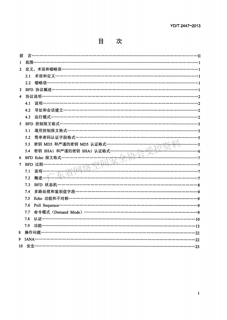 YD-T-2447-2013348072@abc4个月前发布关注私信1.78MB27页031YD-T-2447-2013此内容为付费资源,请付费后查看¥17¥23黄金会员免费钻石会员免费立即购买您当前未登录!建议登陆后购买,可保存购买订单付费资源 第1页 / 共27页 第2页 / 共27页 试读已结束,还剩25页,您可下载完整版后进行离线阅读 THE END标准规范 文本预览 1CS01.040.33L78YD中华人民共和国通信行业标准YD/T2447-2013公众P网络可靠性空资料双向转发检测(BFD机制的技术要求东省网IPnetwork reliability-Technical requirements for bidirectional forwarding detection2013-04-25发布2013-06-01实施中华人民共和国工业和信息化部发布 查看更多 收起部分 喜欢就支持一下吧收藏