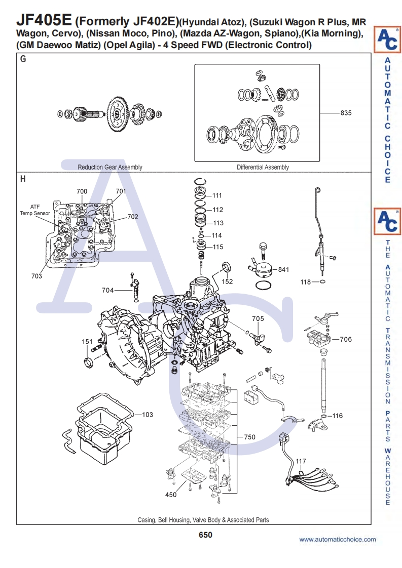 JF405E(Formerly JF402E)(Hyundai Atoz),(Suzuki Wagon R Plus,MRWagon,Cervo),(Nissan Moco,Pino),(Mazda AZ-Wagon,Spiano),(Kia Morning),(GM Daewoo Matiz)(Opel Agila)-4 Speed FWD(Electronic Control)A800801803804150802101200Oil PumpInput ShaftOutput GearB25010244-00-0WLow Reverse Brake808251105000Low Clutch810652811,81381265665065165365465581443-024--0C0000C809Planetary AssembliesLow One Way ClutchE252820106657658201H4ZO-00-Oz107High Clutch2538225001088232020003WOow109Reverse Clutch,2-4 Band End CoverRevision 11/2014649www.automaticchoice.com