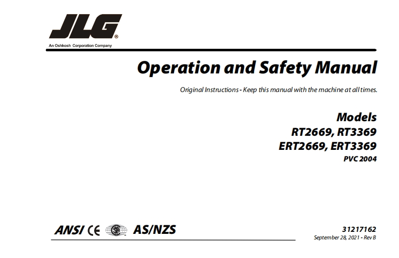 GAn Oshkosh Corporation CompanyOperation and Safety ManualOriginal Instructions-Keep this manual with the machine at alltimes.ModelsRT2669,RT3369ERT2669,ERT3369PVC 2004ANSIC∈@AS/NZS31217162September 28,2021-Rev B