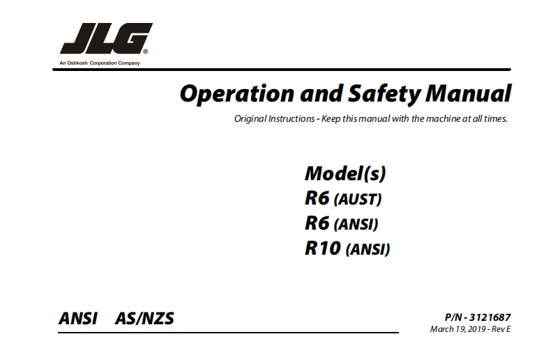 GAn Oshkosh Corporation CompanyOperation and Safety ManualOriginal Instructions-Keep this manual with the machine at all times.Model(s)R6 (AUST)R6(ANSI)R10 (ANSI)ANSI AS/NZSP/N-3121687March 19,2019-Rev E