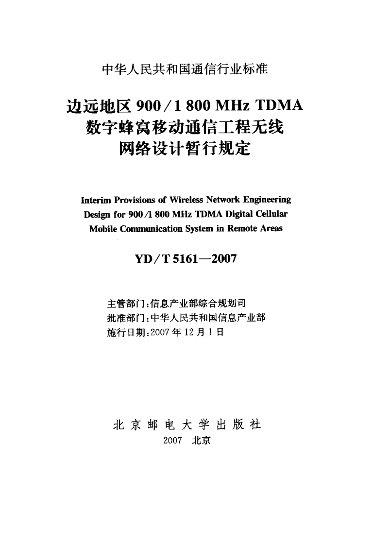 YD中华人民共和国通信行业标准YD/T5161-2007边远地区900/1800 MHz TDMA数字蜂窝移动通信工程无线网络设计暂行规定Interim Provisions of Wireless Network EngineeringDesign for 900/1 800 MHz TDMA Digital CellularMobile Communication System in Remote Areas2007-10-25发布2007-12-01实施中华人民共和国信息产业部发布