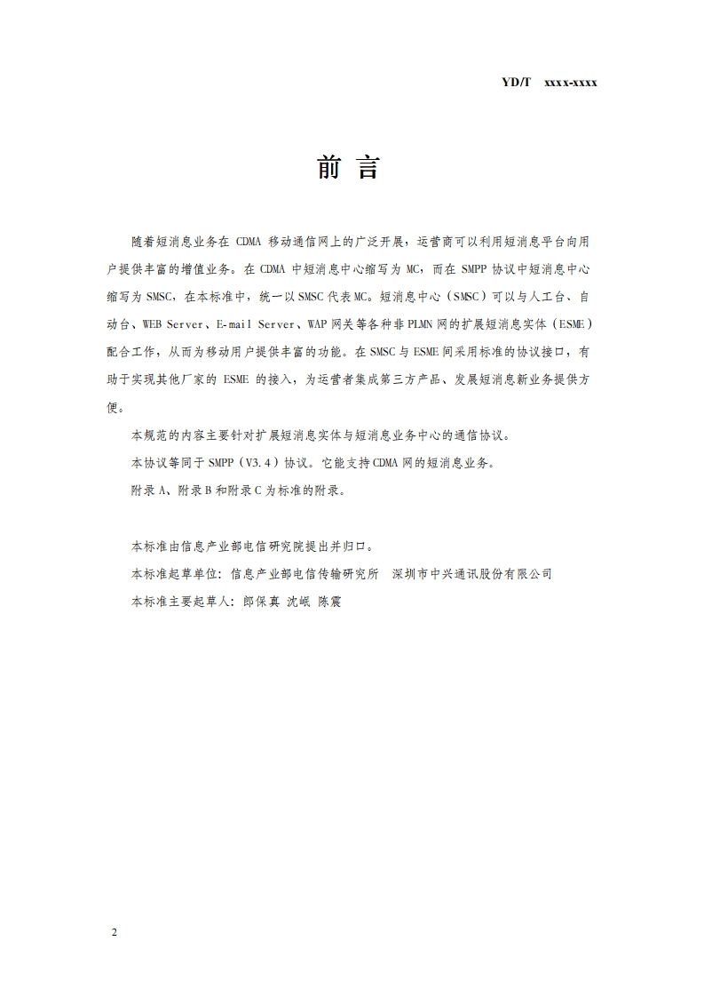 YD中华人民共和国通信行业标准YD/T XXXX-XXXX800 MHz CDMA数字蜂窝移动通信网扩展短消息实体到短消息中心的接口协议规范800MHz CDMA Digital Cel lular Mobile Telecommuni cationProtocol Specification for the Interface of Extended ShortMessage Entities(ESMEs)to Message Centres(MCs)(征求意见稿)20Xx-XX-Xx发布20xX-XX-Xx实施中华人民共和国信息产业部发布