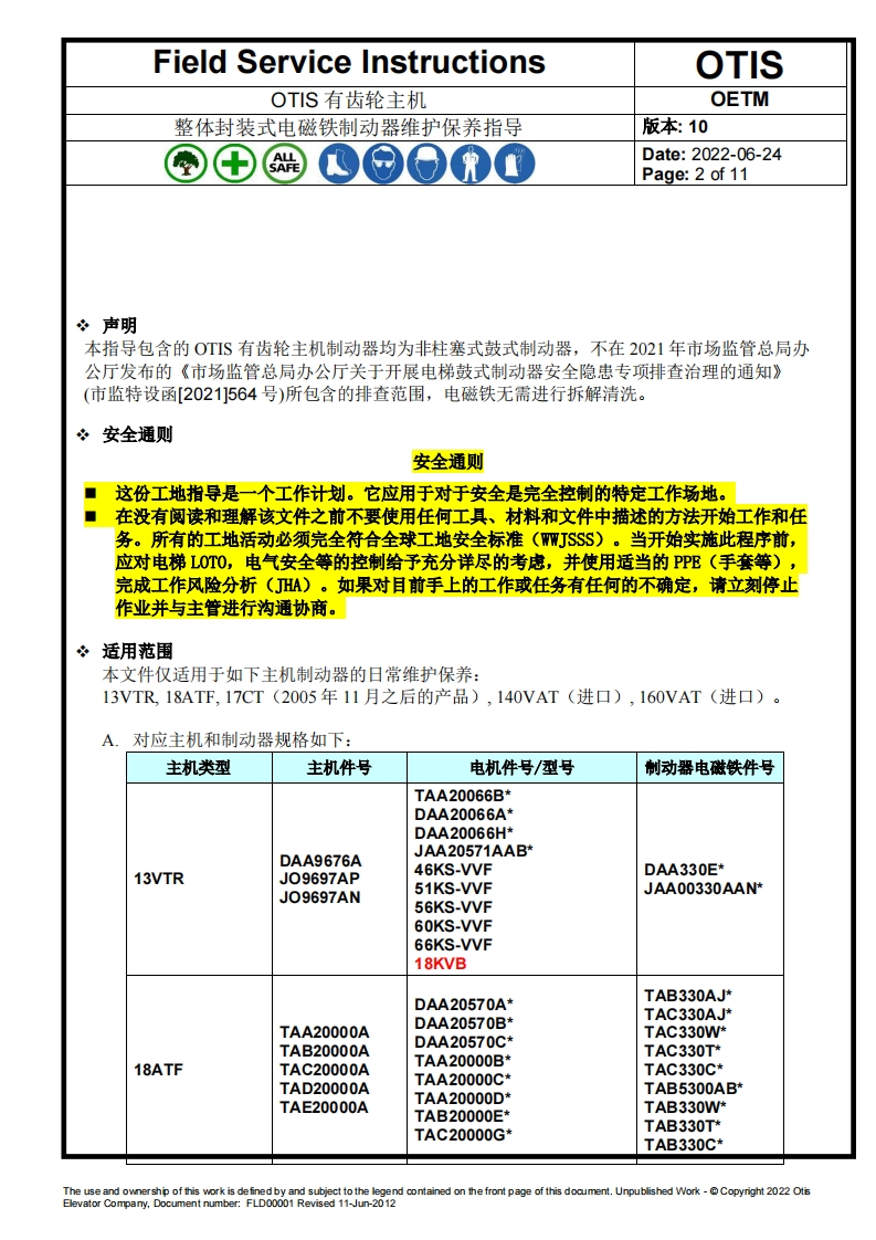 Field Service InstructionsOTISOT1S有齿轮主机OETM整体封装式电磁铁制动器维护保养指导版本:10®⊕姗①⊙OR①Date:2022-06-24Page:1 of 11Original:Prepared byDateChecked byDateApproved byDateNiu Yanchao2021-05-24 Tang Zhengzong2021-05-24Gao Guochen2021-05-24Revision history:Rev.DateRevised byChecked byApproved byDescription of Change(Include section number affected)2021-08-02Niu YanchaoTang ZhengzongGao Guochen文件标准化)章节2:更新清洁剂和润滑脂型号2021-10-14Niu YanchaoTang ZhengzongGao Guochen增加章节4.3,检查填充树脂2021-11-17Niu YanchaoTang ZhengzongGao Guochen增加声明描述:增加日本生产的13VTR主机。2021-11-30Niu YanchaoTang ZhengzongGao Guochen增加18AFT主机件号.2021-12-27Niu YanchaoTang ZhengzongGao Guochen1.更正笔误,更改17CT主机影响日期,从2015年11月变更为2005年11月。2.制动器电磁铁件号增加“*”2022-2-10Niu YanchaoTang ZhengzongGao Guochen1.电机件号增加“*”2022-2-18Niu YanchaoTang ZhengzongGao Guochen1.增加13VTR电机件号/型号:46KS-WF、51KS-WF、56KSVF、60KS-WF、63KSVVF:2.增加18ATF制动器件号:TAB5300AB*2022-3-30Niu YanchaoTang ZhengzongGao Guochen1.增加18ATF制动器件号:TAB330W、TAB330T、TAB330C*2022-6-24Niu YanchaoTang ZhengzongGao1.增加13VTR电机件号/型号:Guochen18KVBThis work and the information it contains are the property of Otis Elevator Company("Ois").It is delivered to others on the express condition that it will be used only for,or on behalf of,Otis:that neither it nor the information it containswill be reproduced or disclosed,in whole or in part,without the prior written consent of Otis;and that on demand it and any copies will bepromptly returned to Otis.This work and the information it contains (collectively referred to as Work')are the confdential property of the Otis Elevator Compamy (Ofis').This Work is deliveredon the express condition that:it will be used or reproduced by Otis employees exdus ively for,or on behalf of,Ofis;it will not be disclosed,reproduced,or distributed