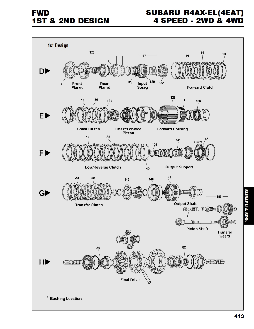 SUBARU R4AX-EL (4EAT)FWD4 SPEED-2WD 4WD1ST 2ND DESIGN1st Design929070AExtensionHousingBell Housing190Case196195PanservoandValve Body00000a一@PumpB111CoverPinion Shaft00立100Pump Body114COrDD0720百工EO115 Turbine Shaft11930124Reverse Clutch10High ClutchHigh Hub60Band120117*Bushing Location412