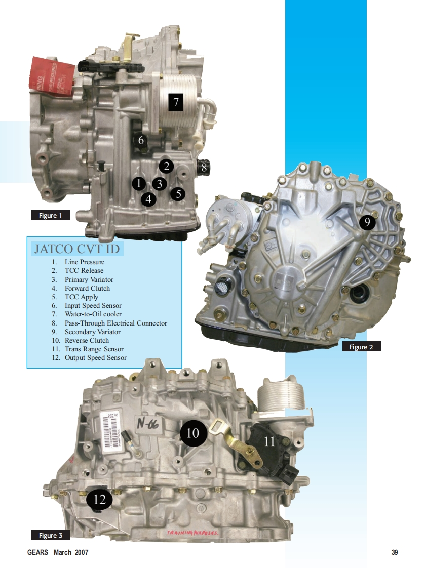 JATCO CVT andDaimlerChrysler,by Sean BoylePart 1An Overview and aLook at Power FlowaimlerChrysler has joined thecedure follows along the same linesTrailer towing.ranks of many manufactur-as the NAG (722.6)and even the newTaxi,police or delivery serviceers offering a Continuously62TE.There's no dipstick:customers(commercial service).Variable Transmission (CVT).Theare encouraged to take their vehicle toOff-road or desert operation.2007 Jeep Compass,Patriot,and Dodgea repair facility every 15,000 miles toHeavy loadingCaliber come equipped with an option-have a trained technician check theiral CVT produced by JATCO.Accordingfluid.A special tool,Miller part numberMechanical:Externalto a local Dodge dealership,they can't9336.is used to check the level.whichA quick look at the CVT revealskeep the CVT Calibers in stock.Thisdepends on fluid temperature.Since thetwo Hall Effect speed sensors (ISSdealer sold the first fifty Calibers with-fluid level can change almost 12mmand OSS),a transmission range sensorin a month and is anxiously waiting forfrom70°Fto190°F,the level must be(TRS),a water-to-oil cooler,and a mul-more.checked with the 9336 dipstick andtitude of pressure taps.The componentsThis CVT isn't new technology;cross-referenced to a chart or table.are labeled on the following picturesin fact,the unit is similar to the CVTFrom the bottom of the internal stop the(Figures 1,2 3,see next page).found in many Nissans since 2002.Influid level should be:There are pressure taps all over thisthis article,we'll focus on the mechan-transmission,but don't just plug anyical and hydraulic operation of theTemperatureHighLOwpressure gauge into these ports.Use aJATCO CVT used in DaimlerChrysler77℉38mm25mmgauge that's rated for at least 1000 psi.vehicles.In the next issue,we'll look138℉42mm29mmTypical operating pressures can eas-into the electronic and computer con-191℉46mm34mmily approach 800-900 psi to ensuretrol systems.necessary side force on the CVT beltIt all begins with the basics,andThe fluid is expected to last the life(Figure 4,see page 40).nothing gets more basic than check-of the vehicle,but maintenance sched-When montoring pressures,you'lling fluid,right?The CVT uses a spe-ule B (which pertains to most vehicles)see the secondary variator pressurescial fluid,designated CVTF+4,whichwould require the fluid to be changedpeak momentarily when rolling to ais specifically designed for the CVT.every60,000 miles.According tostop.This lowers the effective ratioAccording to DaimlerChrysler,the unitDaimlerChrysler,schedule B includesbefore the vehicle comes to a com-requires this special fluid because of thevehicles driven under any of these con-plete stop.Once the transmissions stops"higher pressure,special metal alloys,ditions:rotating,the CVT can't change ratios,and the critical need to prevent beltAt temperatures below 32Fbecause the variators need to rotate toslippage."For ID purposes,the fluid is(0C).change ratios;more on that later.green and,according to the m