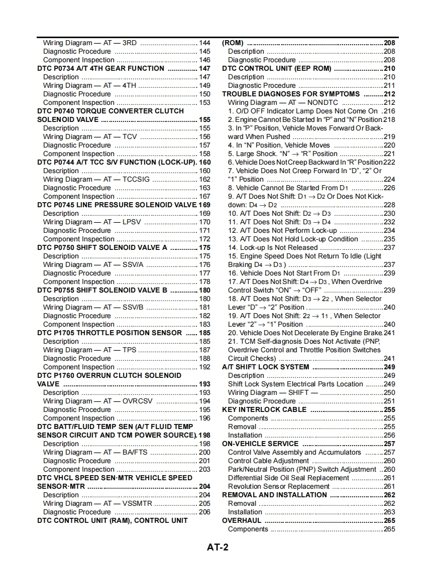C TRANSMISSION/TRANSAXLESECTIONATAUTOMATIC TRANSAXLECONTENTSRE4F03BTROUBLE DIAGNOSIS-GENERAL DESCRIP-Tl0N…83TROUBLE DIAGNOSIS -INDEX.............Symptom Chart ...83Alphabetical P No.Index for DTC........................1TCM Terminals and Reference Value .................106PRECAUTIONS…TROUBLE DIAGNOSIS FOR POWER SUPPLY...110Precautions for Supplemental Restraint SystemWiring Diagram-AT-MAIN.110(SRS)"AIR BAG"and "SEAT BELT PRE-TEN-Diagnostic Procedure...111HDTC P0705 PARK/NEUTRAL POSITION (PNP)Precautions forOn Board Diagnostic(OBD)SystemSWITCH....113of A/T and Engine.9Description.....….113Wiring Diagram-AT-PNP/SWService Notice or Precautions11.114Diagnostic Procedure...115Wiring Diagrams and Trouble Diagnosis12Component Inspection117PREPARATION.13DTC P0710 A/T FLUID TEMPERATURE SENSORSpecial Service Tools13.118Commercial Service Toolsn16OVERALL SYSTEM…17Wiring Diagram-AT-FTS.119A/T Electrical Parts Location17Diagnostic Procedurea..m120Circuit Diagram.…18Component Inspection ..............Cross-sectional View ...19.122DTC P0720 VEHICLE SPEED SENSOR-A/T(REV-Hydraulic Control Circuit20OLUTION SENS0R)….123Shift Mechanism...21Description........123Control System28Wiring Diagram-AT-VSSA/T ......124Control Mechanism.............30Diagnostic Procedure.125MControl Valve ......34DTC P0725 ENGINE SPEED SIGNALONBOARDDIAGNOSTICSYSTEMDESCRIPTION……127Descriptic0n..............12736Wiring Diagram-AT-ENGSSIntroduction......….12836Diagnostic Procedure...129OBD-II Function for A/T System..............36DTC P0731 A/T 1ST GEAR FUNCTION.131One or Two Trip Detection Logic of OBD-II ..........36Description131OBD-II Diagnostic Trouble Code (DTC)36Wiring Diagram-AT-1ST.....................133Malfunction Indicator Lamp (MIL)....................40Diagnostic Procedure.134CONSU儿T-ll…40Component Inspection ......135TROUBLE DIAGNOSIS -INTRODUCTION .........55DTC P0732 A/T 2ND GEAR FUNCTION.137Introduction55Work Flow.......59Description1.37Wiring Diagram-AT-2ND.139TROUBLE DIAGNOSIS-BASIC INSPECTION ..62Diagnostic Procedure140AT Fluid check62Component Inspection141Stall Test…62DTC P0733 A/T 3RD GEAR FUNCTION.142Line Pressure Test….66Description142Road Test67AT-1