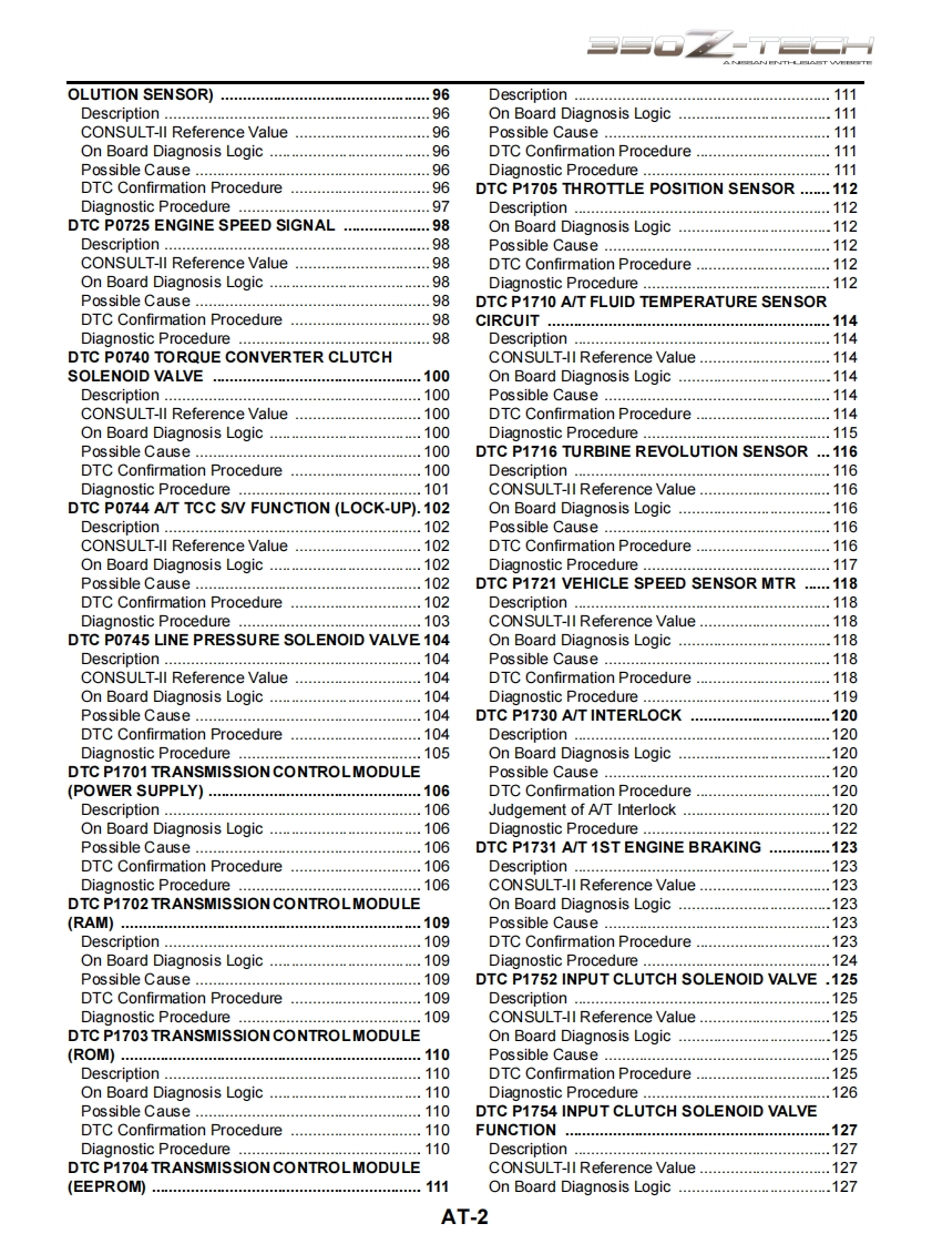 C TRANSMISSION/TRANSAXLESECTIONATAUTOMATIC TRANSMISSIONCONTENTSINDEX FOR DTC…5How To Perform Trouble Diagnosis For Quick andAphabetical Index5Accurate Repair..41DTC No.Index6A/T Electrical Parts Location ..........46PRECAUTIONS>Circuit Diagram..…48GPrecautions for Supplemental Restraint SystemWiring Diagram-AT-49(SRS)“AIR BAG"and“SEAT BELT PRE-TEN-Inspections Before Trouble Diagnosis55SIONER”7Check Before Engine is Started..................59Precautions for Battery Service....7Check at ldle........59Precautions forOn Board Diagnostic(OBD)SystemCruise Test-Part1.…61of A/T and Engine…Cruise Test-Part 263Precautions.......Cruise Test-Part 364Service Notice or Precautions.w....a.a.....m..8Vehicle Speed When Shifting Gears65Wiring Diagrams and Trouble Diagnosis .8Vehicle Speed When Perfomming and ReleasingPREPARATION9Complete Lock-up.…65Special Service Tools9Vehicle Speed When Performing and ReleasingCommercial Service Tools.9Slip Lock-up .....65A/T FLUID..n.10Symptom Chart.6Changing A/T Fluid10TCM Input/Output Signal Reference Values.74Checking A/T Fluid .....10CONSULT-II .....75A/T Fluid Cooler Cleaning.............a11Diagnostic Procedure Without CONSULT-II .........87A/T CONTROL SYSTEM ..15DTC U1000 CAN COMMUNICATION LINE .......89Cross-Sectional View15Description........9Shift Mechanism ..............16On Board Diagnosis Logic89TCM Function27Possible cause..89MCAN Communication ...28DTC Confimmation Procedure89Input/Output Signal of TCM.28Diagnostic Procedure....................90Line Pressure Control29DTC P0615 START SIGNAL CIRCUIT91Shift Control.30Description..91Lock-Up Control31On Board Diagnosis Logic...91Engine Brake Control ........33Possible Cause.…91Control Valve33DTC Confimmation Procedure91ON BOARD DIAGNOSTIC (OBD)SYSTEM ............35Diagnostic Procedure...........92Introduction........5DTC P0705 PARK/NEUTRAL POSITION SWITCH..94OBD-II Function for A/T System35Description.94One or Two Trip Detection Logic of OBD-II ..........35CONSULT-II Reference Value 94OBD-II Diagnostic Trouble Code (DTC),35On Board Diagnosis Logic ............................94Malfunction Indicator Lamp (MIL)......38Possible Cause..…94TROUBLE DIAGNOSIS…39DTC Confimmation Procedure94DTC Inspection Priority Chart.....39Diagnostic Procedure ..........9539DTC P0720 VEHICLE SPEED SENSOR A/T(REV-AT-1