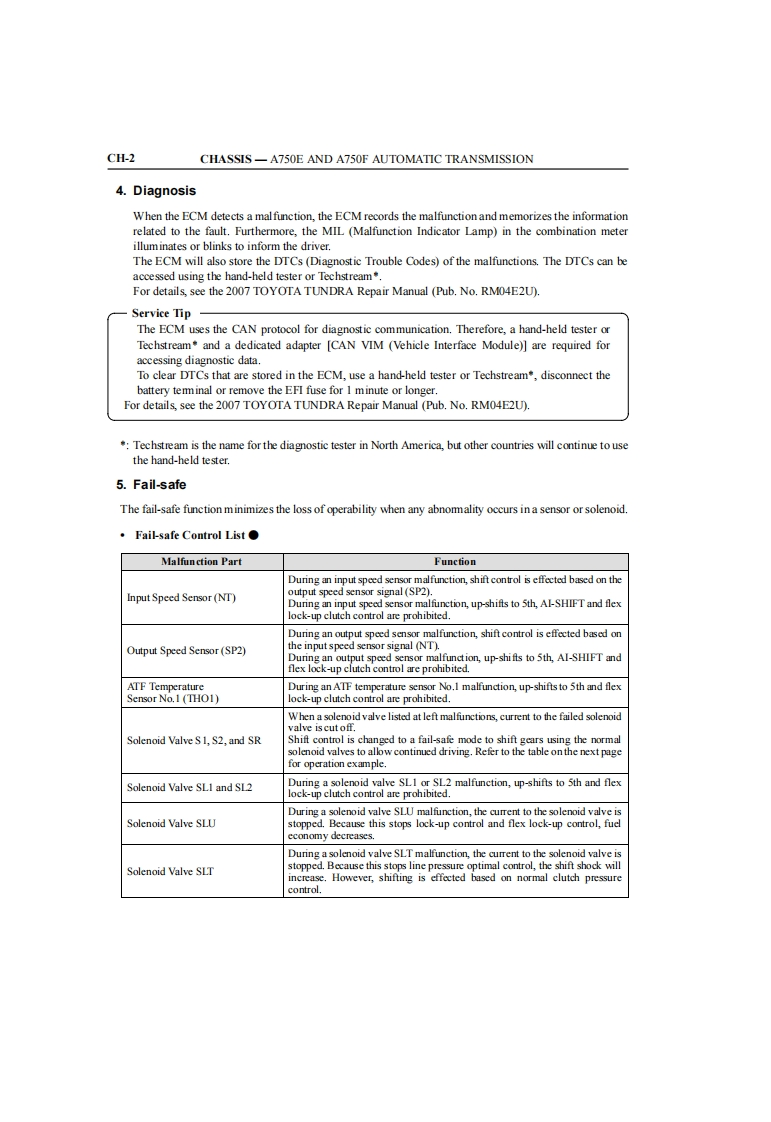 CH-2CHASSIS-A750E AND A750F AUTOMATIC TRANSMISSIONA750E AND A750F AUTOMATIC TRANSMISSION●DESCRIPTIONAn A750E (for 2WD model)or A750F (for 4WD model)5-speed Super ECT (Electronic ControlledTransmission)is used.The only difference between the A750E and A750F is in the extension housing andoutput shaft.These automatic transmissions are equipped with multi-mode automatic transmission function.Fordetails,see page CH-34.These automatic transmissions are equipped with an ATF warmer as standard equipment to warm up ATF..Some models are alsoequipped withan ATF cooler as an optiontoensure high ATF cooling performance.Either a column shift lever or floor shift lever is available depending on the seat type (bench type orseparate type).The ATF warmer,ATF cooler,column shift lever and floor shift lever are available as shown below.x:Standard OP:Option -Not EquippedEngine TypeIGR-FE2UZ-FE(Transmission Type)(A750E)(A750E,A750F)Cab TypeRegularDoubleRegularDoubleCrewMaxDeck typeStandard LongStandardStandardLongStandardLongShortATF WarmerATF CoolerOPOPOPOPColumn Shift LeverX幻文Floor Shif LeverOPOP*1,×*2OP×*2Except Limited Grade2:Limited Grade Only00006A750E (For 2WD)A750F (For 4WD)04F0CH124C