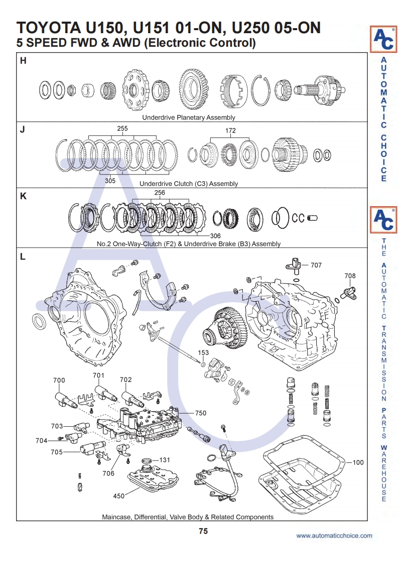T0Y0TAU150,U15101-0N,U25005-0N5 SPEED FWD AWD(Electronic Control)A120A15550@000000Oil Pump Forward(C1)Clutch Drum04-0B2500000000①@300UIO-0WForward (C1)ClutchCounter Drive Gear251o0C0001st Reverse Brake(B2)Assembly301252-Iw00000 CDO2nd Brake(B1)Assembly302--UE四丽@00Front Rear PlanetaryFC4Z0-00-OZ00No.1 One-Way-Clutch(F1)Assembly Rear Planetary Sun GearG403253254170171c000a34xWIO303304828O.D.Direct Clutch.Direct Clutch (C2)&End Cover74Revision 01/2015www.automaticchoice.com