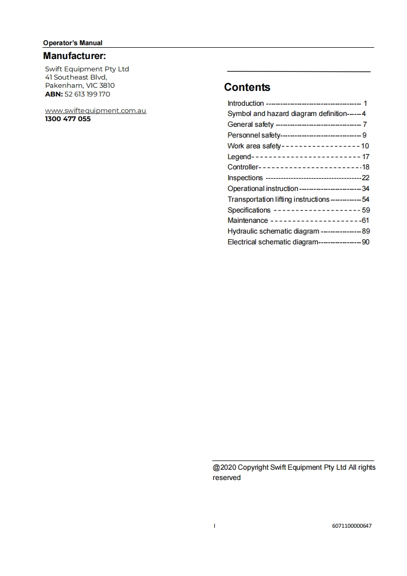 SWIFT EQUIPMENTSwift Equipment Pty Ltd41 Southeast Blvd,Pakenham,VIC 3810ABN:52613199170SWIFT 0612LSWIFT 0812LElevating Work PlatformOPERATORS MANUALSwift Equipment Pty LtdProud Member of:41 Southeast Blvd,Pakenham,VIC 3810ABN:52613199170www.swiftequipment.com.auEWPA1300477055Elevating Work Platform Association
