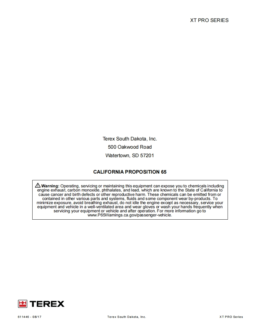☒TEREXHI-RANGERXT PRO SERIESOPERATOR'S MANUALThis Operator's Manual MUST BE READ prior to operating yourXT PRO SERIES Overcenter Articulating Aerial Device.PRINTED IN THE USAOriginal Instructions in EnglishTerex South Dakota,Inc.61144608/2017