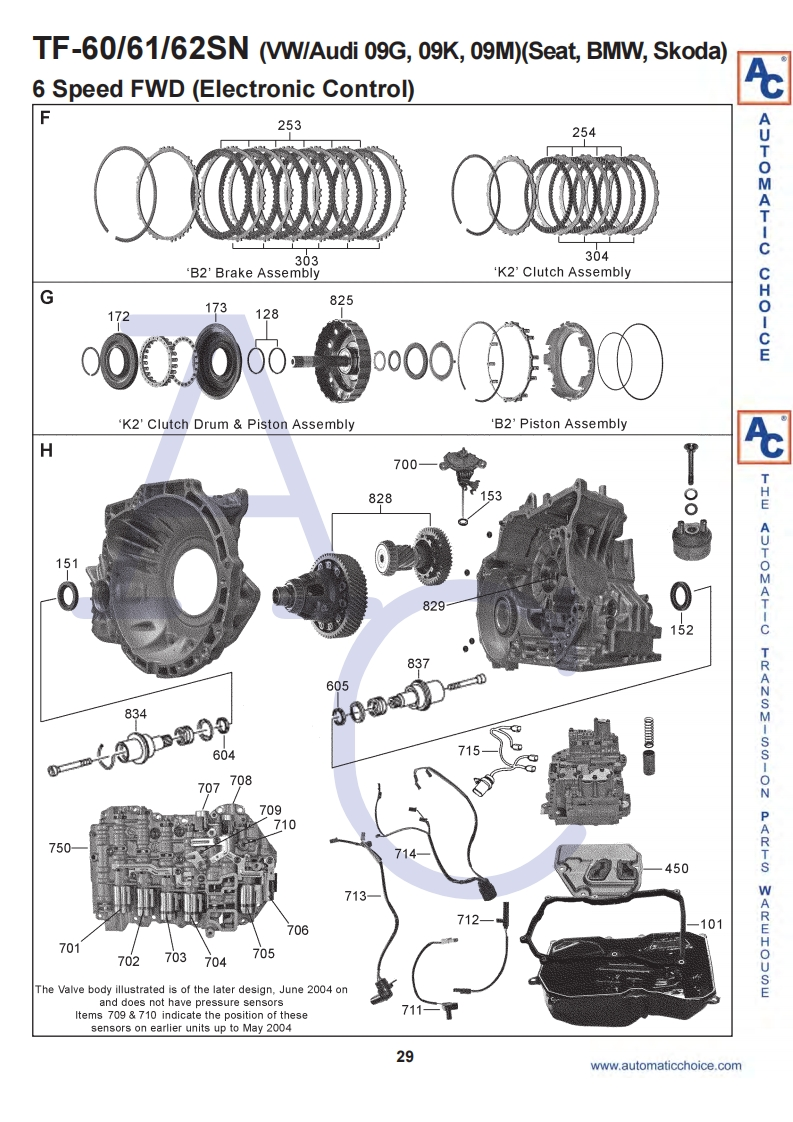 TF-60/61/62SN (VWIAudi 09G,09K,09M)(Seat,BMW,Skoda)6 Speed FWD(Electronic Control)A800100150550120000043HO00Pump AssemblyB1'Piston,Apply SleeveB25080800000,-w300B1'Brake Assembly'K3'Clutch Drum Piston Assembly2518110000o000oo00301K3'ClutchFront Planetary Input Shaft/AnulusD252127心0000co0412HC4Z0-0S-N302815'K1'Clutch AssemblyE821c@0n06000034WIOCentre Support Transfer Drive GearLow OWC,Rear Planetary Sun GearRevision 02/201528www.automaticchoice.com