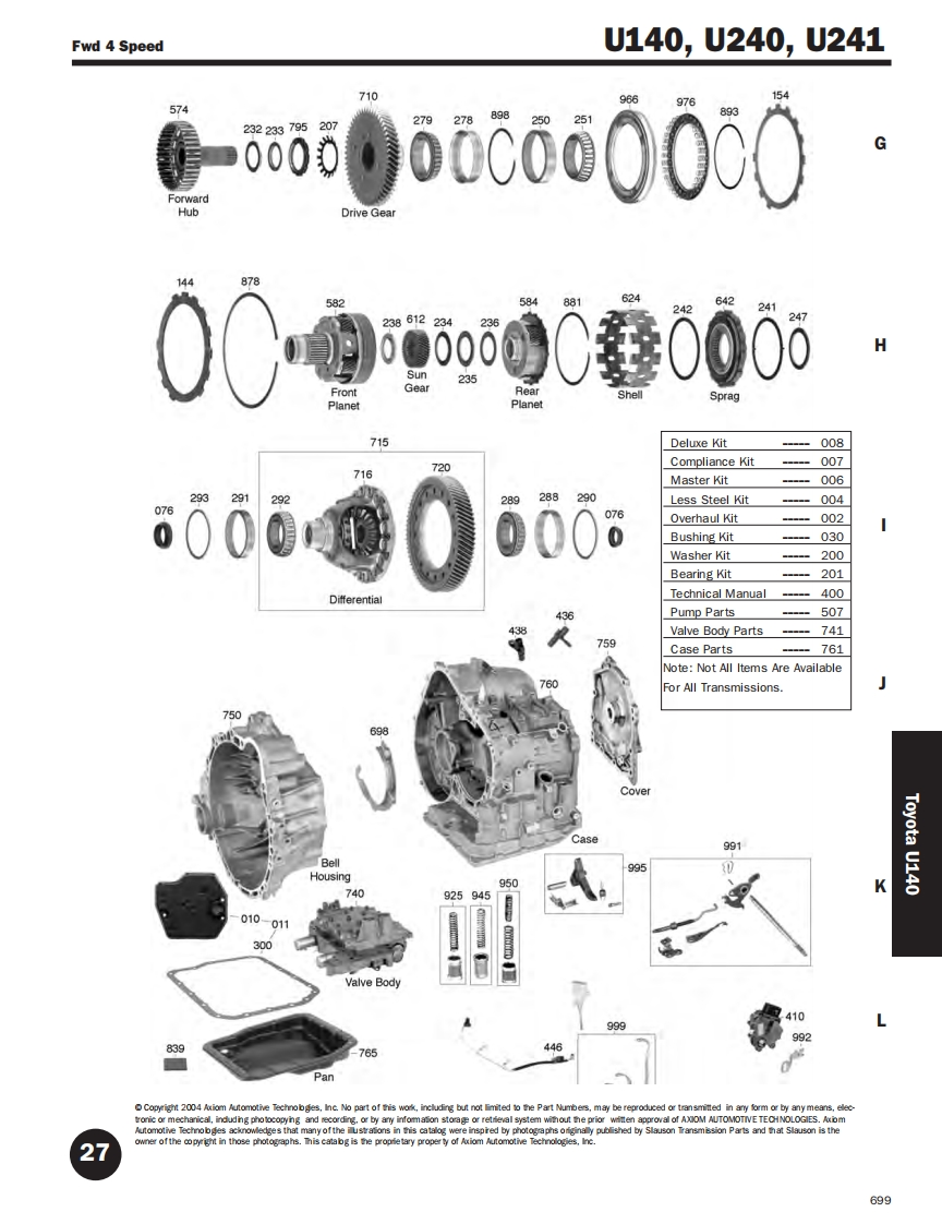 U140,U240,U241Fwd 4 Speed5005205105549641289740000月00ForwardBodyForward ClutchGearDrumStator13414B0垂000000882592874Low /Rev.Hub2nd BrakeClutch87912657525000975217555DirectDrumDirect HubDirecClutch0861143103◇o0m。06000400①2251252UnderdrivePlanetGearBrake #1Gear00●600000560UnderdriveSpragUnderdriveDrumBrake #2o themay ben omehanicainchotonand rcording.obainorm onorremwthout therof OM AU M27Auomotve Technologies acinowledges that many of the iustrations n this catalog were inspired by photographs originaly published by Sauson Transmission Par ts and that Slauson is the ownerof the copyright in those photographs.This catabg is the propfetary proper ty of Axom Automotive Technologies.Ine.698
