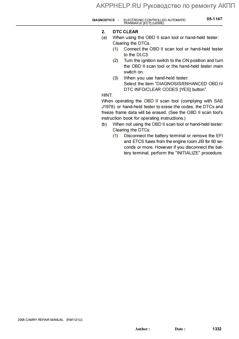 AKPPHELP.RU PykoBOACTBo no peMoHTy AKnn05-1146DIAGNOSTICS·ELECTRONIC CONTROLLED AUTOMATICTRANSAXLE [ECT](U250E)FC2-0CHECK MODE PROCEDURE1.DTC CHECK(CHECK MODE)HINT:Hand-held tester only:Compared to the normal mode,the check mode is more sensi-tive for detecting malfunctions.Furthermore,the same diag-nostic items which are detected in the normal mode can also bedetected in the check mode.(a)Procedure for Check Mode using the hand-held tester.(1)Check the initial conditions.★Battery positive voltage 11 V or more★Throttle valve fully closedTransaxle in the P or N positionDLC3★A/C switch is off(2)Turn the ignition switch off.Hand-Held(3)Connect the hand-held tester to the DLC3.TesterG25136(4)Tum the ignition switch to the ON position and turnthe hand-held tester main switch on.(5)When you use hand-held tester.Select the item "DIAGNOSIS/ENHANCED OBD II/0.13 sec.0.13sec.CHECK MODE"(Check that the MIL flashes).NOTICE:ONAll DTCs and freeze frame data recorded will be erased if:1)the hand-held tester is used to change the ECM fromnormal mode to check mode or vice-versa;or 2)duringOFFcheck mode,the ignition switch is turned from the ON toBR3904ACC position or tumed OFF.(6)Start the engine(the MIL goes off after the enginestarts).(7Perform "DRIVE PATTERN"for the ECT test(Or,simulate the conditions of the malfunction de-scribed by the customer).NOTICE:Leave the ignition switch in the ON position until you havechecked the DTCs,etc.(8)After simulating malfunction conditions,use thehand-held tester diagnosis selector to check theDTCs and freeze frame data,etc.(9)When you use hand-held tester.Select the item "DIAGNOSIS/ENHANCED OBD II/DTC INFO/CURRENT CODES".(10)After checking the DTC,inspect the applicable cir-cuit.(11)See pag to confirm the details of theDTCs.2005 CAMRY REPAIR MANUAL (RM1121U)Author:Date:1331
