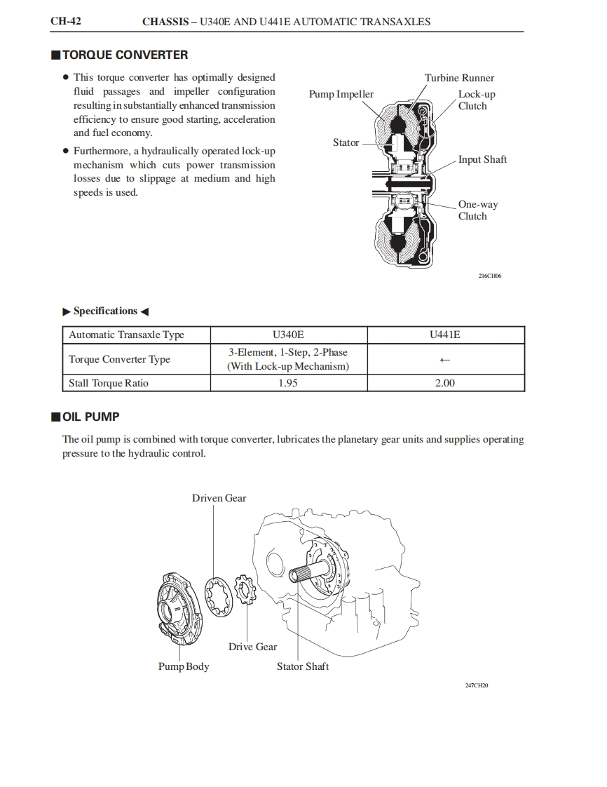 CHASSIS-U340E AND U441E AUTOMATIC TRANSAXLESCH-41U340E AND U441E AUTOMATIC TRANSAXLES■DESCRIPTION.The new model uses 2 types (U340E,U441E)of automatic transaxle.A U340E automatic transaxle is provided on the INZ-FE engine model,and a U441E automatic transaxleis provided on the 2NZ-FE engine model..A low-viscosity type automatic transmission fluid (Toyota Genuine ATF WS)is used for the U340Eautomatic transaxle..Shift control in uphill/downhill traveling is used for the automatic transaxles.The basic construction of the automatic transaxles is the same as on the previous model.CH171CH03165aH23U340E Automatic TransaxleU441E Automatic TransaxleSpecificationTransaxle TypeU340EU441EEngine Type1NZ-FE2NZ-FElst2.8472.8752nd1.5521.568Gear Ratio3rd1.000←4th0.7000.696Reverse2.3432.300Differential Gear Ratio*14.2374.375Fluid Capacity*2Liters (US qts,Imp.qts)6.4(6.78,5.63)5.6(5.96,4.96)Fluid TypeToyota Genuine ATF WSToyota GenuineATF Type T-IVWeight(Reference)*3kg (1b)68.5(150.7)56.7(124.7)*1:Counter Gear Ratio Included*2:Differential Included*3:Weight shows the figure with the fluid fully filled.