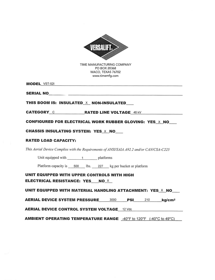 VERSALIFT。Operator's ManualVST-36/40/47/52-lAerial DeviceSERIAL NUMBER39014-03MANUAL PART NUMBERPLEASE NOTETHEANSIAS2.2STANDARD AND THE MANUAL OF RESPONSOCONTACEUPDATED INFORMATION.DEALERS,OWNERS,USERS,OPERATORS,LESSORS AND LESSEES MUST ADHERE TOTHESE UPDATED STANDARDS.ATTENTION:ADO NOT ATTEMPT TO OPERATE THIS VERSALIFT UNTILYOU HAVE READ AND UNDERSTOOD ALL INFORMATION IN BOTHOPERATOR'S AND SERVICE MANUALS,PROVIDED WITH EACHVERSALIFT.THIS MANUAL CONTAINS CONEIDENTIAL INEORMATIONAND IS THE SOLE PROPERTY OF TIME MANUFACTURING CO.CONTENTS ARE NOT TO BE DISCLOSED,COPIED,OR REPRODUCEDIN ANY MANNER WITHOUT THE EXPRESSED,WRITTEN PERMISSIONOF TIME MANUFACTURING CO.TimETime Manufacturing Co.7601 Imperial Drive P.O.Box 20368 Waco,Texas 76702 Phone:254-399-2100 Fax:254-751-0775Time Manufacturing Co.reserves the right to improve the design or change specifications at any time without notice.06/16