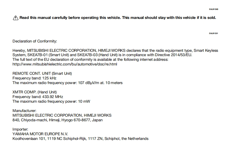 多YAMAHARead this manual carefullybefore operating this vehicle.Safety informationOWNER'S MANUALDescriptionSmart key systemSpecial featuresInstrument and control functions5For your safety -pre-operation checks6Operation and important riding pointsPeriodic maintenance and adjustment8Scooter care and storage9MOTORCYCLESpecifications10XP560E (TMAX)Consumer informationXP560D (TMAX TECH MAX)Index2B3T-28199-E0