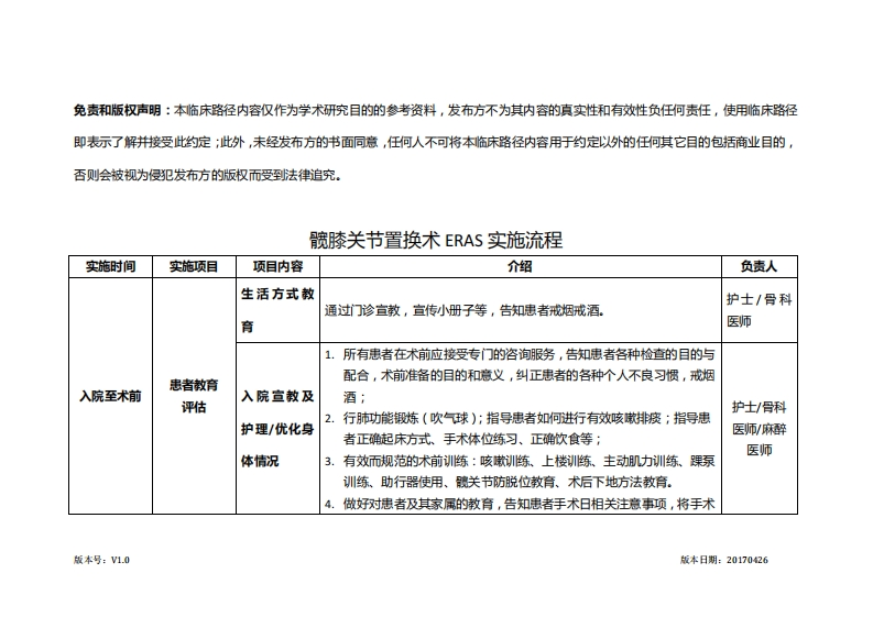 免责和版权声明:本临床路径内容仅作为学术研究目的的参考资料,发布方不为其内容的真实性和有效性负任何责任,使用临床路径即表示了解并接受此约定;此外,未经发布方的书面同意,任何人不可将本临床路径内容用于约定以外的任何其它目的包括商业目的,否则会被视为侵犯发布方的版权而受到法律追究。髋膝关节置换术ERAS实施流程实施时间实施项目项目内容介绍负责人生活方式教护士/骨科通过门诊宣教,宣传小册子等,告知患者戒烟戒酒。育医师1.所有患者在术前应接受专门的咨询服务,告知患者各种检查的目的与配合,术前准备的目的和意义,纠正患者的各种个人不良习惯,戒烟患者教育入院至术前入院宣教及评估酒:护士/骨科2.行肺功能锻炼(吹气球):指导患者如何进行有效咳款排痰;指导患护理/优化身者正确起床方式、手术体位练习、正确饮食等:医师/麻醉医师体情况3.有效而规范的术前训练:咳嗽训练、上楼训练、主动肌力训练、踝泵训练、助行器使用、髋关节防脱位教育、术后下地方法教育。4.做好对忠者及其家属的教育,告知忠者手术日相关注意事项,将手术版本号:V1.0版本日期:2017026