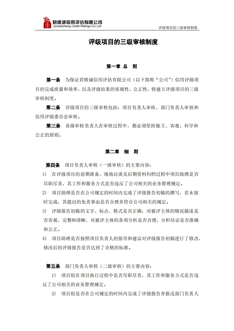 裙维诚信用评估有限公司Junweicheng Credit Ratings Co.,Ltd评级项目的三级审核制度评级项目的三级审核制度第一章总则第一条为保证君维诚信用评估有限公司(以下简称“公司”)信用评级项目的完成质量和效率,以及评级结果的客观性、公正性,特建立评级项目的三级审核制度。第二条评级项目的三级审核包括:项目负责人审核、部门负责人审核和信用评级委员会审核。第三条各级审核负责人在审核过程中,都必须坚持独立、客观、科学和公正的原则。第二章细则第四条项目负责人审核(一级审核)的主要内容:1)在评级项目的前期准备、现场访谈及后期资料归档过程中项目助理是否尽职尽责,其工作和服务方式是否违反了公司相关的业务管理规定。2)项目助理是否在公司规定的时间内完成了评级报告初稿的撰写,若未按时完成,其提出的免责事由是否合理并符合公司相关的规定。3)评级报告初稿的文字、标点、格式是否正确,对被评主体的情况描述是否客观、完整和清晰,对被评主体的各项分析是否合理,分析结论是否准确和公正。4)项目助理是否按照项目负责人的指导和建议对评级报告初稿进行了修改,修改后的评级报告是否达到了合格的标准。第五条部门负责人审核(二级审核)的主要内容:1)项目组在项目执行过程中是否尽职尽责,其工作和服务方式是否违反了公司相关的业务管理规定。2)项目组是否在公司规定的时间内完成了评级报告并报送部门负责人