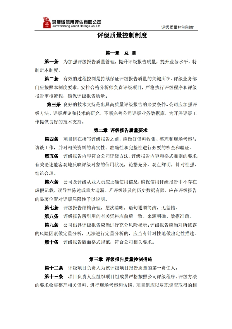 裙维诚信用评估有限公司Junweicheng Credit Ratings Co.,Ltd评级质量控制制度评级质量控制制度第一章总则第一条为加强评级报告质量管理,提升评级报告质量,提升业务水平,特制定本制度。第二条有效的过程控制是持续保证评级报告质量的关键所在。评级业务部门应按照本制度要求,安排合格分析师负责评级项目,严格执行评级程序和评级报告审核流程,确保评级报告质量。第三条良好的技术支持是出具高质量评级报告的必要条件。公司应加强评级方法、评级理论和技术的研究,不断完善公司评级业务数据库,为开展评级工作提供良好的技术支持。第二章评级报告质量要求第四条项目组在撰写评级报告之前,应做好资料收集、整理和现场考察与访谈工作,并对相关资料的真实性、准确性和完整性进行必要的核查和验证。第五条评级报告内容符合公司评级方法、评级报告内容和格式准则的要求,有关论述能客观地反映评级对象的信用状况,论据充分,观点鲜明,针对性强,结论合理。第六条公司及评级从业人员应正确使用信息,确保信用评级报告中不存在虚假记载、误导性陈述或重大遗漏。若评级涉及的历史数据有限,应在评级报告的显著位置对评级局限性予以说明。第七条评级报告结构合理,层次清晰,语句通顺简洁,无差错。第八条评级报告所引用的有关资料应前后一致、来源明确、数据准确。第九条公司出具评级报告应当进行充分风险揭示。评级报告应当对所披露的风险因素做定量分析,无法进行定量分析的,应当有针对性地做出定性描述。第十条评级报告版面格式规范,符合公司相关要求。第三章评级报告质量控制措施第十二条评级项目负责人为该评级项目报告质量的第一责任人。第十三条项目负责人应组织项目组成员严格按照公司评级程序、评级方法的要求收集整理相关资料、进行现场考察和访谈,项目组应以尽职调查取得的相