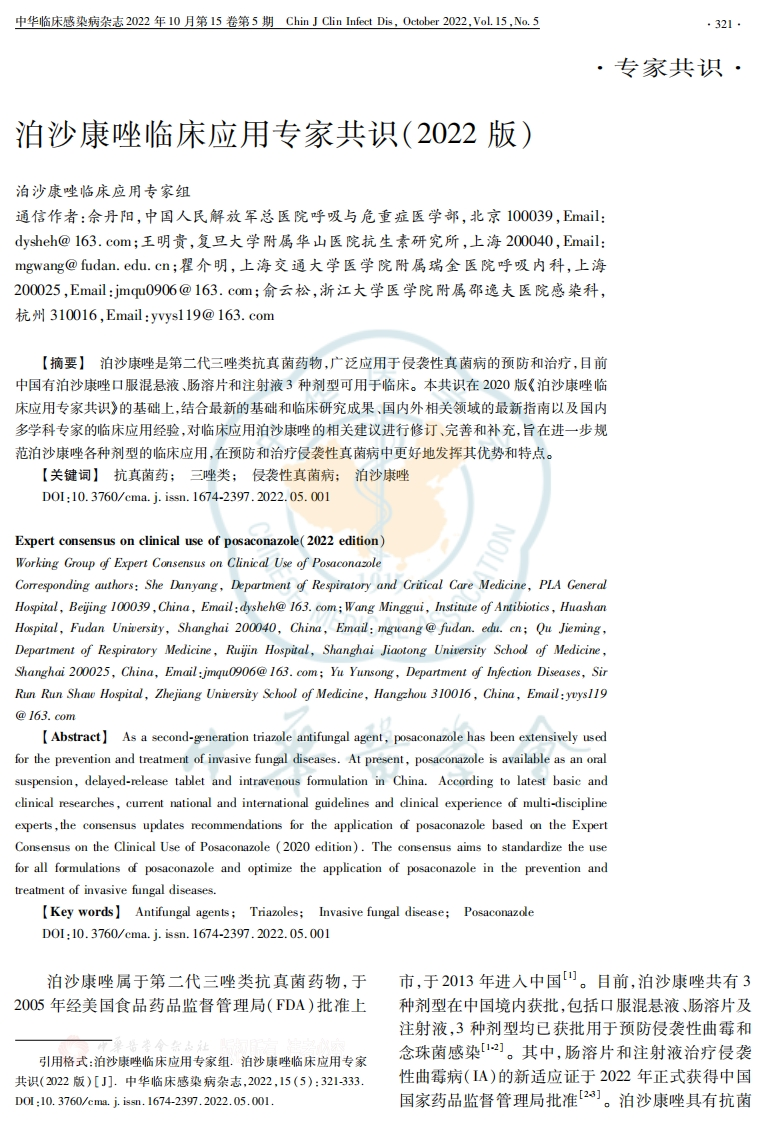 中华临床感染病杂志2022年10月第15卷第5期Chin J Clin Infect Dis,0 ctober2022,Vol.15,No.5·321·专家共识·泊沙康唑临床应用专家共识(2022版)泊沙康唑临床应用专家组通信作者:佘丹阳,中国人民解放军总医院呼吸与危重症医学部,北京100039,Email:dysheh@163.com;王明贵,复旦大学附属华山医院抗生素研究所,上海200040,Email:mgwang@fudan.edu.cn;瞿介明,上海交通大学医学院附属瑞金医院呼吸内科,上海200025,Email:jmgu0906@163.com;俞云松,浙江大学医学院附属邵逸夫医院感染科,杭州310016,Email:yvysl19@163.com【摘要】泊沙康唑是第二代三唑类抗真菌药物,广泛应用于侵袭性真菌病的预防和治疗,目前中国有泊沙康唑口服混悬液、肠溶片和注射液3种剂型可用于临床。本共识在2020版《泊沙康唑临床应用专家共识》的基础上,结合最新的基础和临床研究成果、国内外相关领域的最新指南以及国内多学科专家的临床应用经验,对临床应用泊沙康唑的相关建议进行修订、完善和补充,旨在进一步规范泊沙康唑各种剂型的临床应用,在预防和治疗侵袭性真菌病中更好地发挥其优势和特点。【关键词】抗真菌药;三唑类;侵袭性真菌病:泊沙康唑D0I:10.3760/cma.j.issn.1674-2397.2022.05.001Expert consensus on clinical use of posaconazole(2022 edition)Working Group of Expert Consensus on Clinical Use of PosaconazoleCorresponding authors:She Danyang,Department of Respiratory and Critical Care Medicine,PLA GeneralHospital,Beijing 100039,China,Email:dysheh@163.com;Wang Minggui,Institute of Antibiotics,HuashanHospital,Fudan University,Shanghai 200040,China,Email:mgwang@fudan.edu.cn;Qu Jieming,Department of Respiratory Medicine,Ruiin Hospital,Shanghai Jiaotong University School of Medicine,Shanghai 200025,China,Email:jmqu0906@163.com;Yu Yunsong,Department of Infection Diseases,SirRun Run Shaw Hospital,Zhejiang University School of Medicine,Hangzhou 310016,China,Email:yvys119@163.comAbstract]As a second-generation triazole antifungal agent,posaconazole has been extensively usedfor the prevention and treatment of invasive fungal diseases.At present,posaconazole is available as an oralsuspension,delayed-release tablet and intravenous formulation in China.According to latest basic andclinical researches,current national and international guidelines and cinical experience of multi-disciplineexperts,the consensus updates recommendations for the application of posaconazole based on the ExpertConsensus on the Clinical Use of Posaconazole (2020 edition).The consensus aims to standardize the usefor all formulations of posaconazole and optimize the application of posaconazole in the prevention andtreatment of invasive fungal diseases.[Key words]Antifungal agents;Triazoles;Invasive fungal disease;PosaconazoleD0I:10.3760/cma.j.issn.1674-2397.2022.05.001泊沙康唑属于第二代三唑类抗真菌药物,于市,于2013年进入中国)。目前,泊沙康唑共有320O5年经美国食品药品监督管理局(FDA)批准上种剂型在中国境内获批,包括口服混悬液、肠溶片及注射液,3种剂型均已获批用于预防侵袭性曲霉和引用格式:泊沙康唑临床应用专家组.泊沙康唑临床应用专家念珠菌感染]。其中,肠溶片和注射液治疗侵袭共识(2022版)[J】.中华临床感染病杂志,2022,15(5):321-333.性曲霉病(IA)的新适应证于2022年正式获得中国D0I:10.3760/cma.j.issm.1674-2397.2022.05.001.国家药品监督管理局批准2]。泊沙康唑具有抗菌