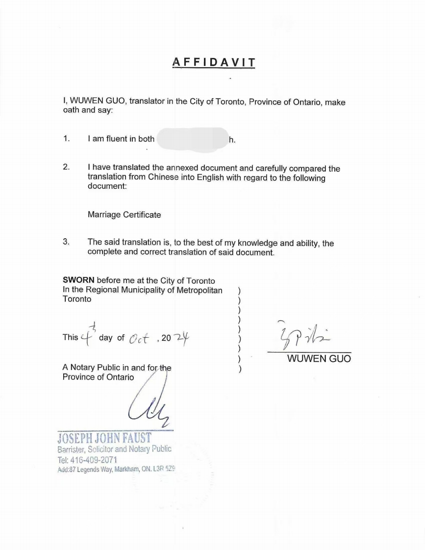 AFFIDAVITI,WUWEN GUO,translator in the City of Toronto,Province of Ontario,makeoath and say:1.I am fluent in bothh.2.I have translated the annexed document and carefully compared thetranslation from Chinese into English with regard to the followingdocument:Marriage Certificate3.The said translation is,to the best of my knowledge and ability,thecomplete and correct translation of said document.SWORN before me at the City of TorontoIn the Regional Municipality of MetropolitanTorontoThis千day of ct,202yiWUWEN GUOA Notary Public in and for theProvince of OntarioJOSEPH JOHN FAUSTBarrister,Solicitor and Notary PublicTel:416-409-2071Add:87 Legends Way,Markham,ON.L3R 5Z9