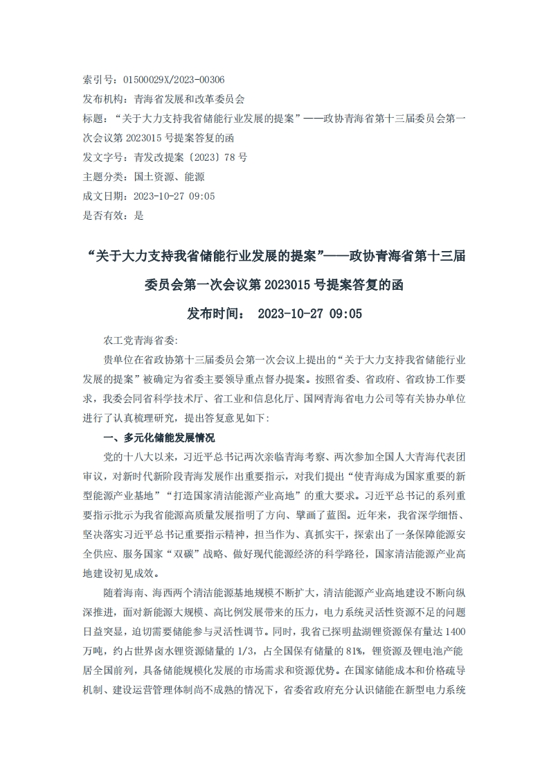 索引号:01500029X/2023-00306发布机构:青海省发展和改革委员会标题:“关于大力支持我省储能行业发展的提案”一一政协青海省第十三届委员会第一次会议第2023015号提案答复的函发文字号:青发改提案〔2023)78号主题分类:国土资源、能源成文日期:2023-10-2709:05是否有效:是“关于大力支持我省储能行业发展的提案”一政协青海省第十三届委员会第一次会议第2023015号提案答复的函发布时间:2023-10-2709:05农工党青海省委:贵单位在省政协第十三届委员会第一次会议上提出的“关于大力支持我省储能行业发展的提案”被确定为省委主要领导重点督办提案。按照省委、省政府、省政协工作要求,我委会同省科学技术厅、省工业和信息化厅、国网青海省电力公司等有关协办单位进行了认真梳理研究,提出答复意见如下:一、多元化储能发展情况党的十八大以来,习近平总书记两次亲临青海考察、两次参加全国人大青海代表团审议,对新时代新阶段青海发展作出重要指示,对我们提出“使青海成为国家重要的新型能源产业基地”“打造国家清洁能源产业高地”的重大要求。习近平总书记的系列重要指示批示为我省能源高质量发展指明了方向、擘画了蓝图。近年来,我省深学细悟、坚决落实习近平总书记重要指示精神,担当作为、真抓实干,探索出了一条保障能源安全供应、服务国家“双碳”战略、做好现代能源经济的科学路径,国家清洁能源产业高地建设初见成效。随着海南、海西两个清洁能源基地规模不断扩大,清洁能源产业高地建设不断向纵深推进,面对新能源大规模、高比例发展带来的压力,电力系统灵活性资源不足的问题日益突显,迫切需要储能参与灵活性调节。同时,我省已探明盐湖锂资源保有量达1400万吨,约占世界卤水锂资源储量的1/3,占全国保有储量的81%,锂资源及锂电池产能居全国前列,具备储能规模化发展的市场需求和资源优势。在国家储能成本和价格疏导机制、建设运营管理体制尚不成熟的情况下,省委省政府充分认识储能在新型电力系统