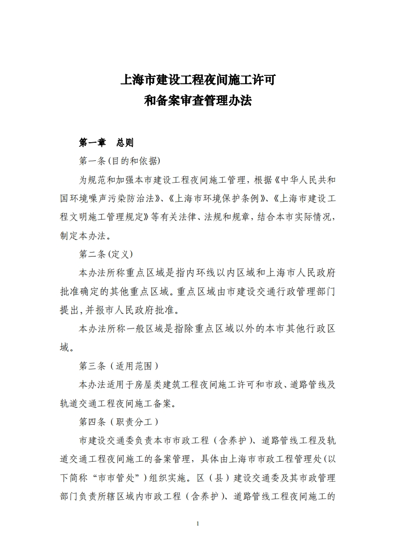 上海市建设工程夜间施工许可和备案审查管理办法第一章总则第一条(目的和依据)为规范和加强本市建设工程夜间施工管理,根据《中华人民共和国环境噪声污染防治法》、《上海市环境保护条例》、《上海市建设工程文明施工管理规定》等有关法律、法规和规章,结合本市实际情况,制定本办法。第二条(定义)本办法所称重点区域是指内环线以内区域和上海市人民政府批准确定的其他重点区域。重点区域由市建设交通行政管理部门提出,并报市人民政府批准。本办法所称一般区域是指除重点区域以外的本市其他行政区域。第三条(适用范围)本办法适用于房屋类建筑工程夜间施工许可和市政、道路管线及轨道交通工程夜间施工备案。第四条(职责分工)市建设交通委负责本市市政工程(含养护)、道路管线工程及轨道交通工程夜间施工的备案管理,具体由上海市市政工程管理处(以下简称“市市管处”)组织实施。区(县)建设交通委及其市政管理部门负责所辖区域内市政工程(含养护入道路管线工程夜间施工的