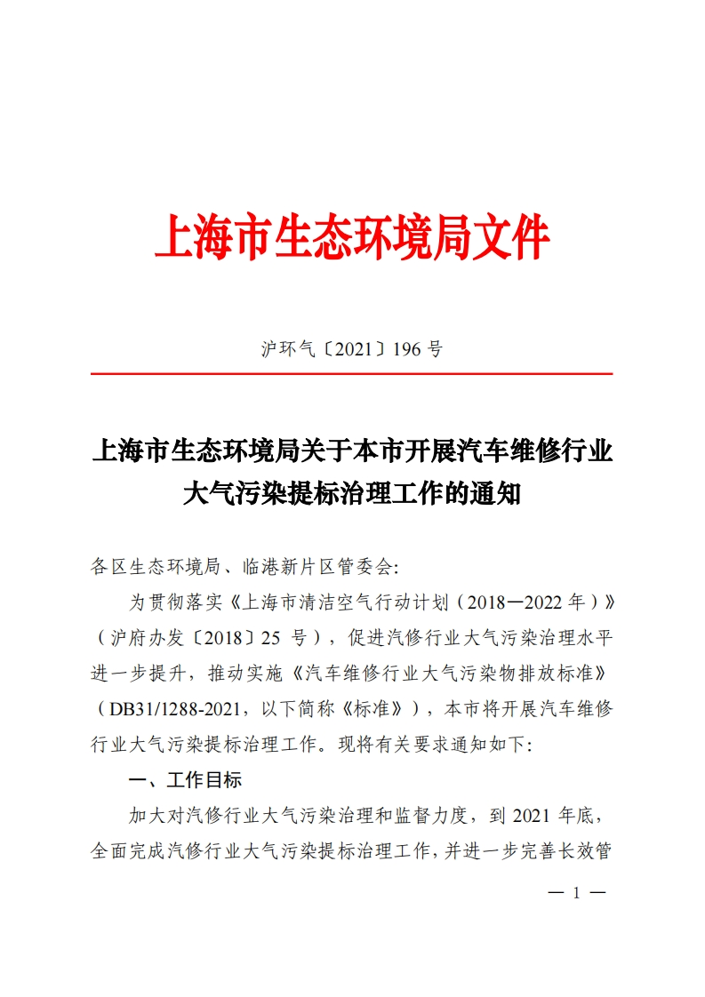 上海市生态环境局文件沪环气〔2021)196号上海市生态环境局关于本市开展汽车维修行业大气污染提标治理工作的通知各区生态环境局、临港新片区管委会:为贯彻落实《上海市清洁空气行动计划(2018一2022年)》(沪府办发〔2018〕25号),促进汽修行业大气污染治理水平进一步提升,推动实施《汽车维修行业大气污染物排放标准》(DB31/1288-2021,以下简称《标准》),本市将开展汽车维修行业大气污染提标治理工作。现将有关要求通知如下:一、工作目标加大对汽修行业大气污染治理和监督力度,到2021年底,全面完成汽修行业大气污染提标治理工作,并进一步完善长效管1