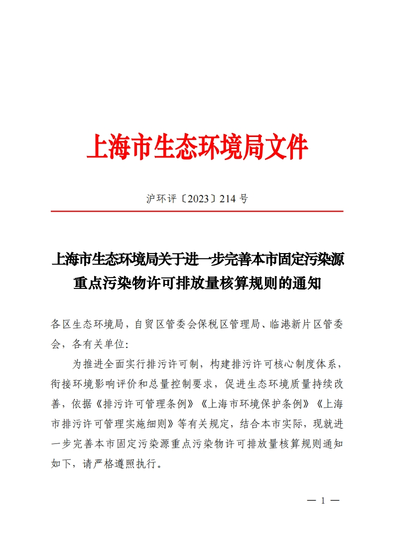 上海市生态环境局文件沪环评〔2023〕214号上海市生态环境局关于进一步完善本市固定污染源重点污染物许可排放量核算规则的通知各区生态环境局,自贸区管委会保税区管理局、临港新片区管委会,各有关单位:为推进全面实行排污许可制,构建排污许可核心制度体系,衔接环境影响评价和总量控制要求,促进生态环境质量持续改善,依据《排污许可管理条例》《上海市环境保护条例》《上海市排污许可管理实施细则》等有关规定,结合本市实际,现就进一步完善本市固定污染源重点污染物许可排放量核算规则通知如下,请严格遵照执行。1